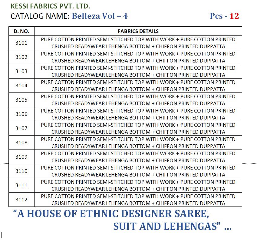 Buy Online Kessi Belleza Vol 4 3101 Series Pure Cotton Suit Deale 12 Pcs of Full Catalogue at Wholesale Price. Looking for Kessi Belleza Vol 4 3101 Series Pure Cotton Suit Deale Full Catalouge at Best Price? Buy Now Kessi Belleza Vol 4 3101 Series Pure Cotton Suit Deale at Wholesale Rate of Rs 8700 with Total 12 Pcs from authroized dealer and supplier of KESSI Brand. Cost of Each piece is just only Rs 725 which is very low and affordable price to resale the product in your retail store ,This is Surat based Wholesale Supplier & Dealer of KESSI Brand. Click on Brand name to Know more about KESSI Brand's products.Call or Whatsapp on 9898838984 for booking or enquiry