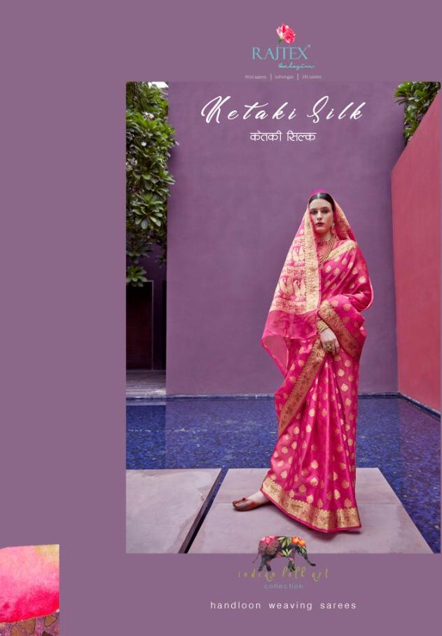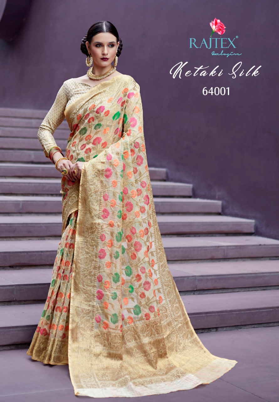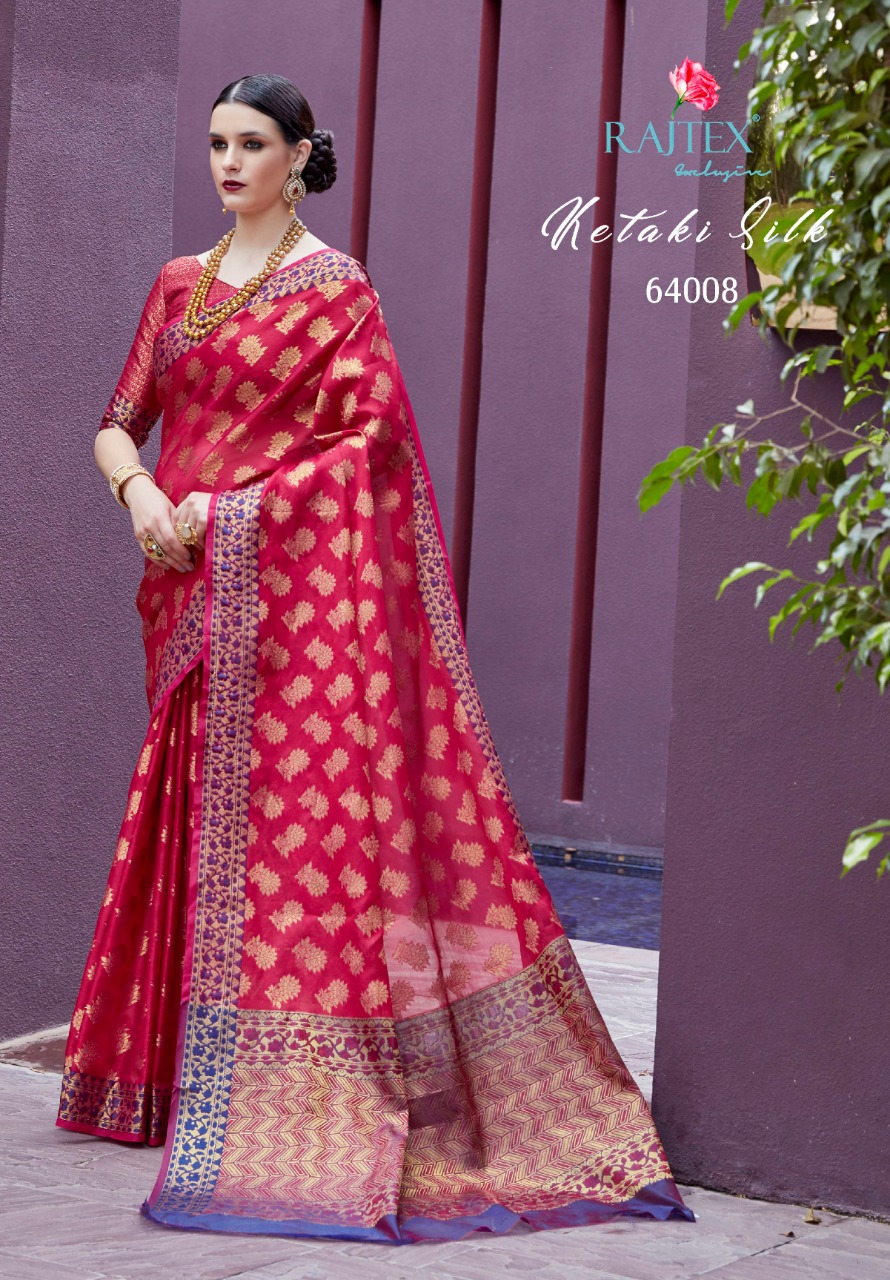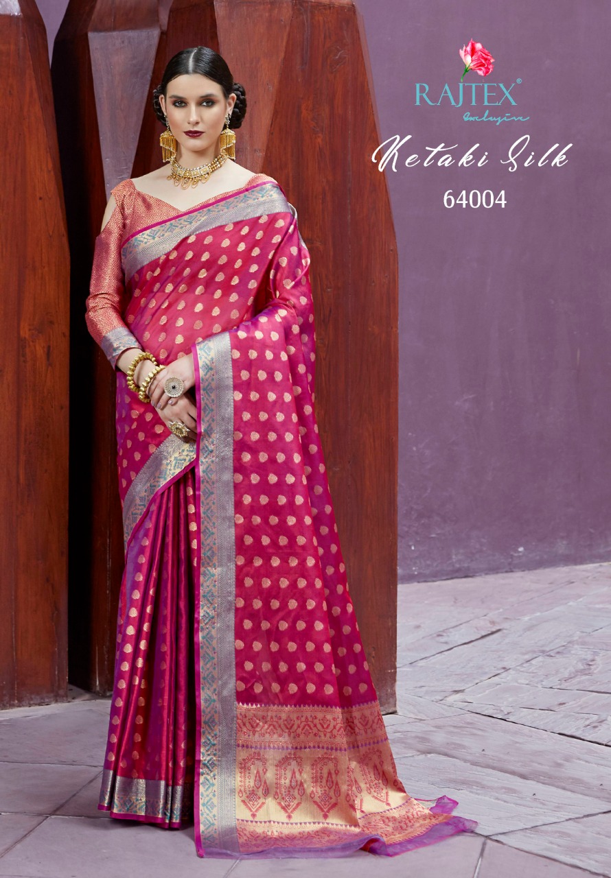 *Ketaki Silk* by Raj Tex . *Organza + Tissue Silk Sarees* series -64001 to 64010. New catlog by Raj tex . Rate - 1200? per Pcs . GST 5 Percent Extra. Delivery from today Please note you cannot sell below company Rate . *RAJTEX FABRICS* |