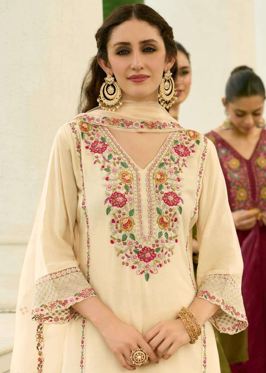 ⭕ Top: Pure Mull Chanderi Kurti with Embroidery & Hand-Work Appliqué ⭕ Sleeves: Embroidered Work ⭕ Pant: Fully Stitched with Lace Detailing ⭕ Dupatta: Organza with Embroidery & Cut-Work
