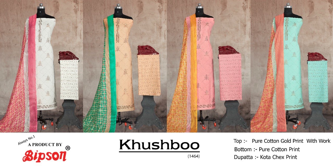 Buy Online Khushboo 1464 By Bipson Wholesaler Supplier From Surat 4 Pcs of Full Catalogue at Wholesale Price. Looking for Khushboo 1464 By Bipson Wholesaler Supplier From Surat Full Catalouge at Best Price? Buy Now Khushboo 1464 By Bipson Wholesaler Supplier From Surat at Wholesale Rate of Rs 1980 with Total 4 Pcs from authroized dealer and supplier of Bipson prints pvt ltd Brand. Cost of Each piece is just only Rs 495 which is very low and affordable price to resale the product in your retail store ,This is Surat based Wholesale Supplier & Dealer of Bipson prints pvt ltd Brand. Click on Brand name to Know more about Bipson prints pvt ltd Brand's products.Call or Whatsapp on 9898838984 for booking or enquiry