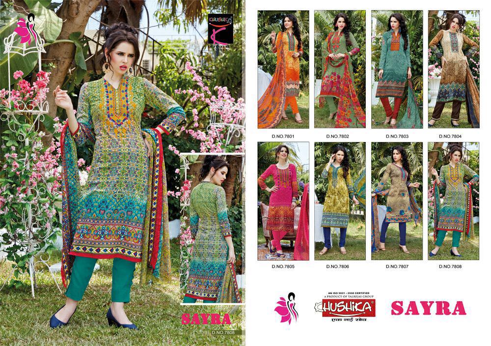 Buy Online Khushika Sayra 7801 Series Pure Cotton Cambric Print Suits 8 Pcs of Full Catalogue at Wholesale Price. Looking for Khushika Sayra 7801 Series Pure Cotton Cambric Print Suits Full Catalouge at Best Price? Buy Now Khushika Sayra 7801 Series Pure Cotton Cambric Print Suits at Wholesale Rate of Rs 4520 with Total 8 Pcs from authroized dealer and supplier of Khushika Brand. Cost of Each piece is just only Rs 565 which is very low and affordable price to resale the product in your retail store ,This is Surat based Wholesale Supplier & Dealer of Khushika Brand. Click on Brand name to Know more about Khushika Brand's products.Call or Whatsapp on 9898838984 for booking or enquiry
