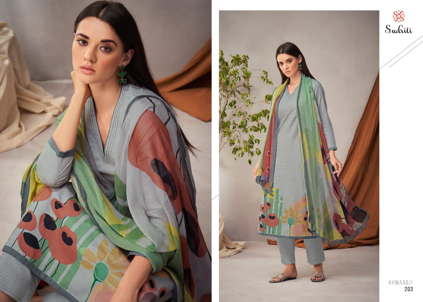 *SUDRITI* A SAHIBA BRAND presents - *KHWAAB* *TOP:* PURE COTTON PRINT WITH HANDWORK *BOTTOM:* COTTON *DUPATTA:* PURE CHIFFON DIGITAL PRINT *RATE:* 1195/- |