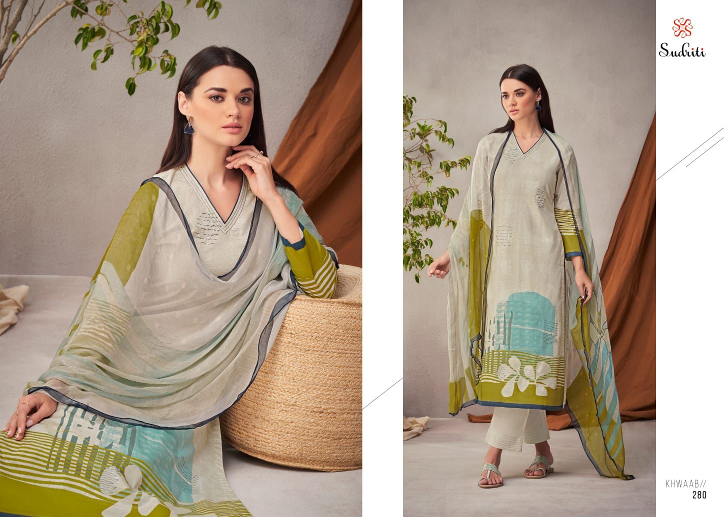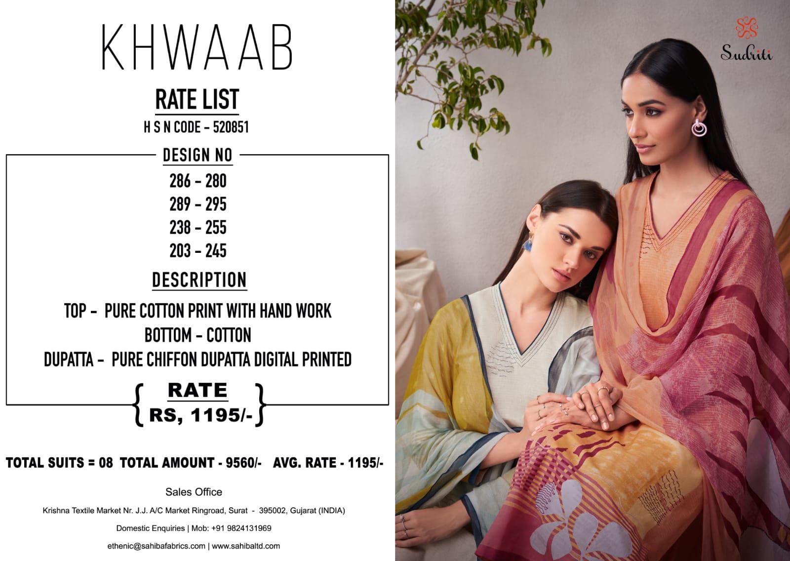 Buy Online Khwaab By Sudriti By Sahiba Designer Suits Wholesale Suppliers And Dealer From India 8 Pcs of Full Catalogue at Wholesale Price. Looking for Khwaab By Sudriti By Sahiba Designer Suits Wholesale Suppliers And Dealer From India Full Catalouge at Best Price? Buy Now Khwaab By Sudriti By Sahiba Designer Suits Wholesale Suppliers And Dealer From India at Wholesale Rate of Rs 9560 with Total 8 Pcs from authroized dealer and supplier of SAHIBA Brand. Cost of Each piece is just only Rs 1195 which is very low and affordable price to resale the product in your retail store ,This is Surat based Wholesale Supplier & Dealer of SAHIBA Brand. Click on Brand name to Know more about SAHIBA Brand's products.Call or Whatsapp on 9898838984 for booking or enquiry