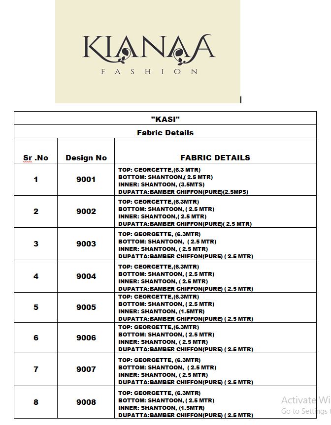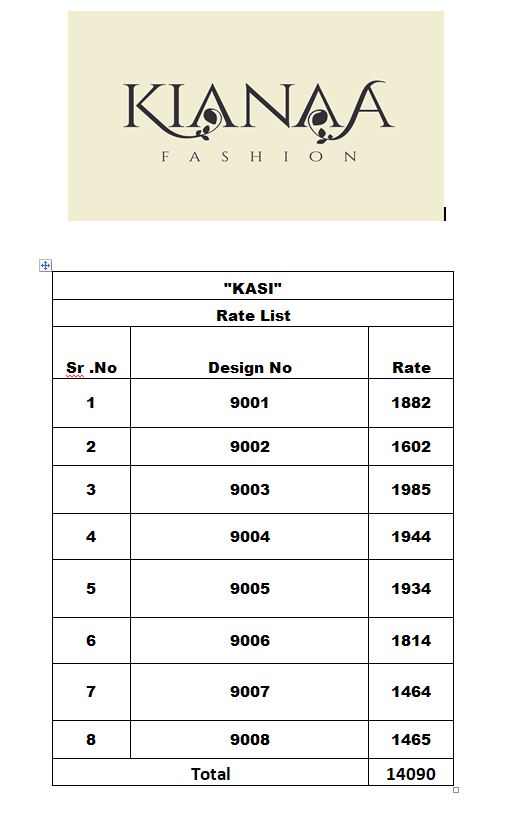Brand - Kiaana . Catlog name - Kashi. Series -9001 to 9008. GST 5 Percent Extra. Delivery from 01-05-18. Book your order |