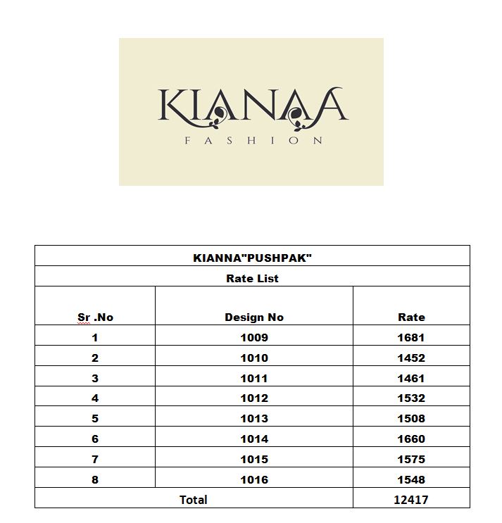 Buy Online Kianaa Saree Pushpak Series 1009 To 1016 Wholesale Supplier 8 Pcs of Full Catalogue at Wholesale Price. Looking for Kianaa Saree Pushpak Series 1009 To 1016 Wholesale Supplier Full Catalouge at Best Price? Buy Now Kianaa Saree Pushpak Series 1009 To 1016 Wholesale Supplier at Wholesale Rate of Rs 12424 with Total 8 Pcs from authroized dealer and supplier of BRAND'S Brand. Cost of Each piece is just only Rs 1553 which is very low and affordable price to resale the product in your retail store ,This is Surat based Wholesale Supplier & Dealer of BRAND'S Brand. Click on Brand name to Know more about BRAND'S Brand's products.Call or Whatsapp on 9898838984 for booking or enquiry