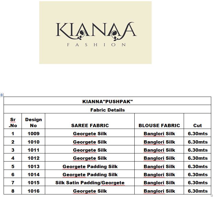 Brand - Kianaa. Tyep - Saree. Catlog name - Pushpak. Series - 1009 to 1016. GST 5 Percent Extra. Delivery in 4-5 days . Book your order *WHATSPP FOR REGULR UPDATES AND BENEFIT +919898838984 |