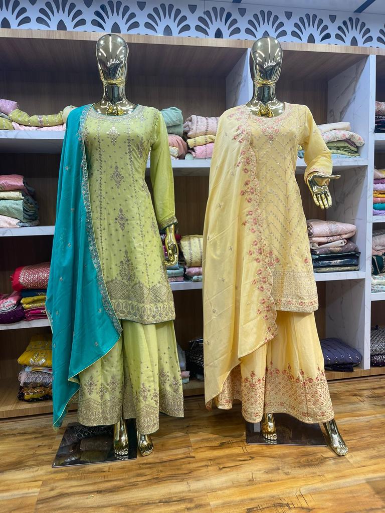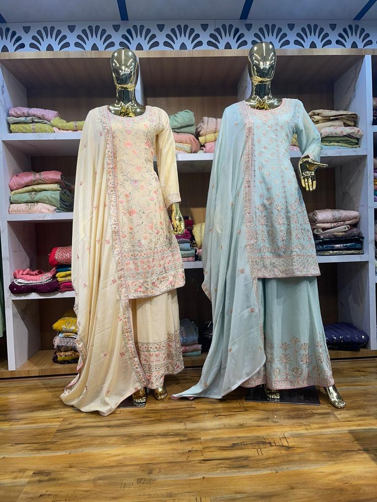 *eba lifestyle* *KIARA* Top - hevey Chinon with embroidery work Plazo - hevey Chinon with embroidery work front back Duppta - hevey Chinon with embroidery *RATE - 2299/-* Gst extra *Size - XL SIZE READY WITH EXTRA MARJIN UPTO 46* 100+Singles |