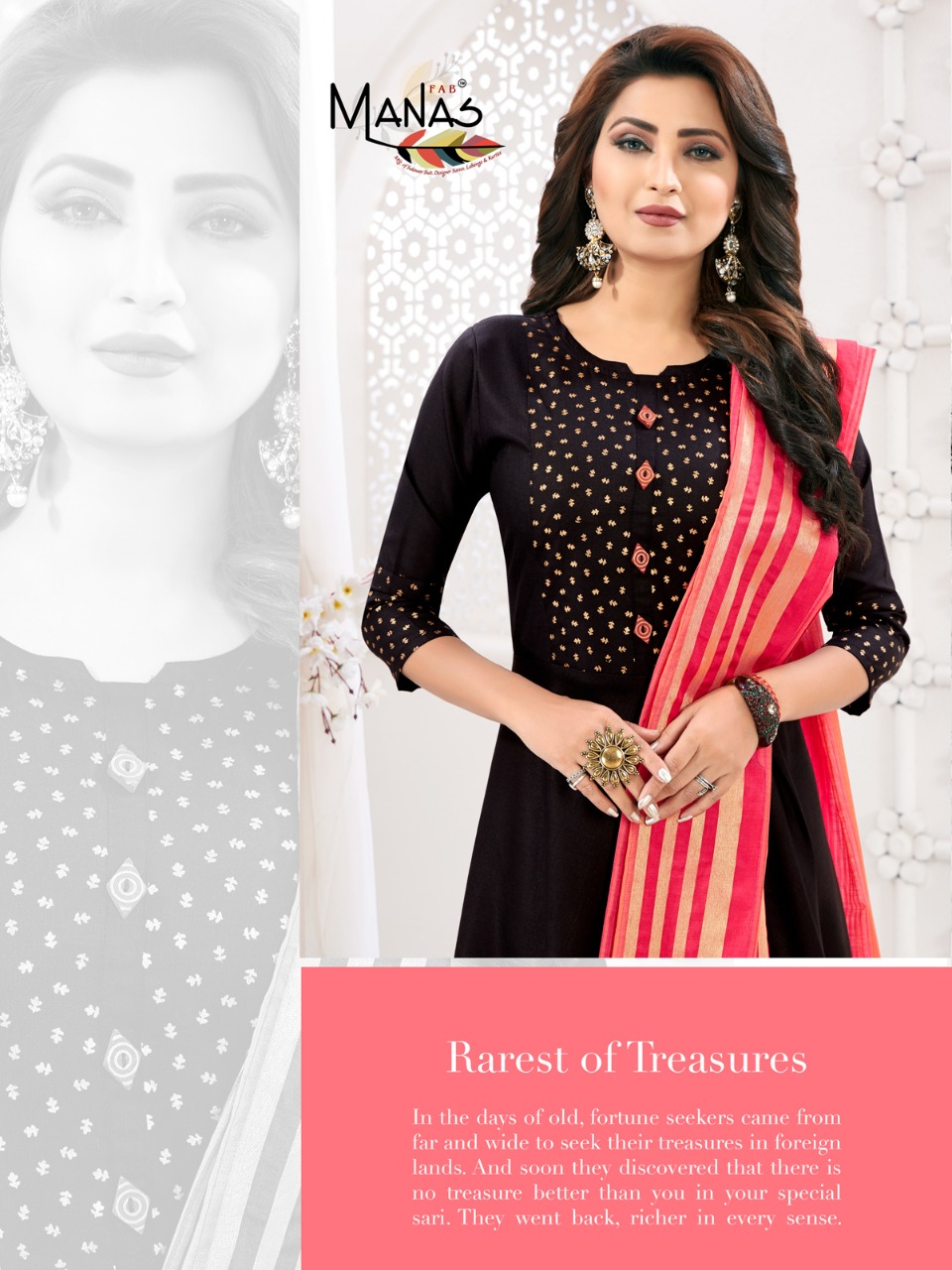 Brand Name : MANAS Catalog : *KIARA* Design : 8 Fabric : Maya slub With Foil Print Duptta fabric: Banarasi Size : M(38), L(40), XL(42), XXL(44) Length: 52 + Dispatched date : 19 July, 2019 Rs 775 + 5% gst |