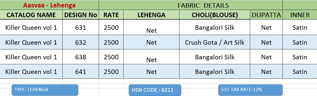 Buy Online Killar Queen Vol 1 By Aasvaa Designer Net Lehngas Wholesale Supplier And Dealer Surat 4 Pcs of Full Catalogue at Wholesale Price. Looking for Killar Queen Vol 1 By Aasvaa Designer Net Lehngas Wholesale Supplier And Dealer Surat Full Catalouge at Best Price? Buy Now Killar Queen Vol 1 By Aasvaa Designer Net Lehngas Wholesale Supplier And Dealer Surat at Wholesale Rate of Rs 10000 with Total 4 Pcs from authroized dealer and supplier of Brand. Cost of Each piece is just only Rs 2500 which is very low and affordable price to resale the product in your retail store ,This is Surat based Wholesale Supplier & Dealer of Brand. Click on Brand name to Know more about Brand's products.Call or Whatsapp on 9898838984 for booking or enquiry