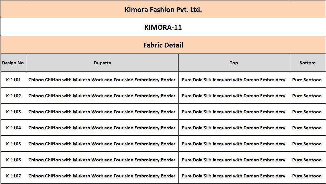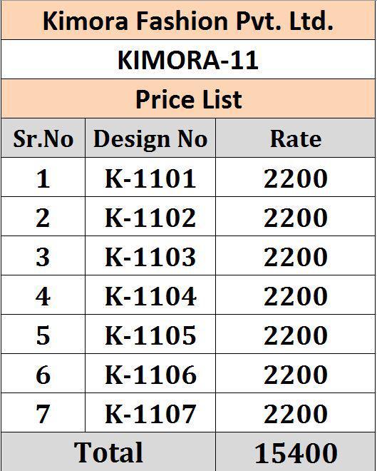 Buy Online Kimora 11 Series K 1101 To K 1107 Designer Party Wear Suits Wholesale Supplier Nd Dealer Gujarat 7 Pcs of Full Catalogue at Wholesale Price. Looking for Kimora 11 Series K 1101 To K 1107 Designer Party Wear Suits Wholesale Supplier Nd Dealer Gujarat Full Catalouge at Best Price? Buy Now Kimora 11 Series K 1101 To K 1107 Designer Party Wear Suits Wholesale Supplier Nd Dealer Gujarat at Wholesale Rate of Rs 15400 with Total 7 Pcs from authroized dealer and supplier of KIMORA Brand. Cost of Each piece is just only Rs 2200 which is very low and affordable price to resale the product in your retail store ,This is Surat based Wholesale Supplier & Dealer of KIMORA Brand. Click on Brand name to Know more about KIMORA Brand's products.Call or Whatsapp on 9898838984 for booking or enquiry