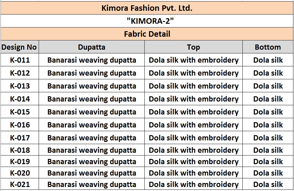 Buy Online Kimora 2 By Kimora Dola Silk Embroidered Designer Party Wear Suits Wholesale Supplier And Dealer India 11 Pcs of Full Catalogue at Wholesale Price. Looking for Kimora 2 By Kimora Dola Silk Embroidered Designer Party Wear Suits Wholesale Supplier And Dealer India Full Catalouge at Best Price? Buy Now Kimora 2 By Kimora Dola Silk Embroidered Designer Party Wear Suits Wholesale Supplier And Dealer India at Wholesale Rate of Rs 19250 with Total 11 Pcs from authroized dealer and supplier of KIMORA Brand. Cost of Each piece is just only Rs 1750 which is very low and affordable price to resale the product in your retail store ,This is Surat based Wholesale Supplier & Dealer of KIMORA Brand. Click on Brand name to Know more about KIMORA Brand's products.Call or Whatsapp on 9898838984 for booking or enquiry