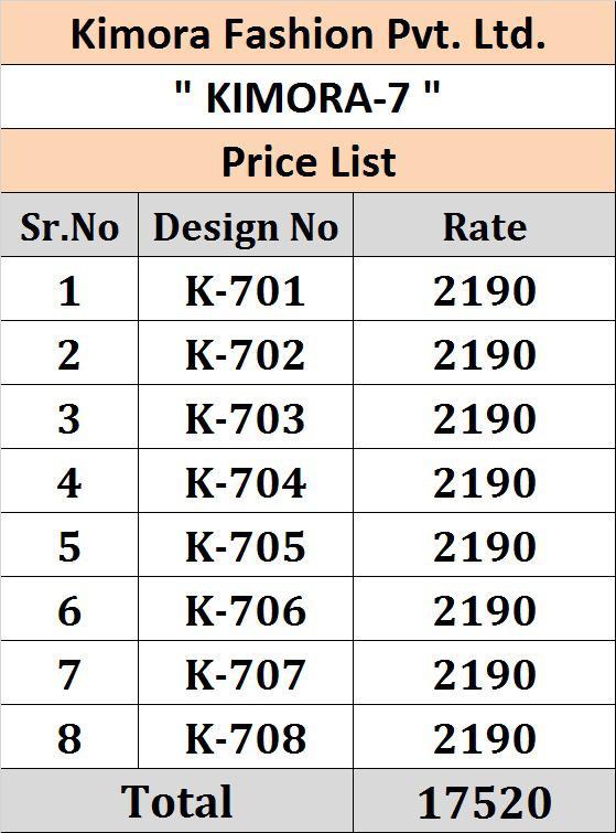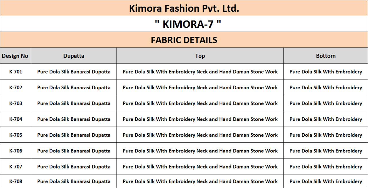 Buy Online Kimora 7 Series K 701 To K 708 Dola Silk Designer Party Wear Suits Wholesale Supplier Gujarat 8 Pcs of Full Catalogue at Wholesale Price. Looking for Kimora 7 Series K 701 To K 708 Dola Silk Designer Party Wear Suits Wholesale Supplier Gujarat Full Catalouge at Best Price? Buy Now Kimora 7 Series K 701 To K 708 Dola Silk Designer Party Wear Suits Wholesale Supplier Gujarat at Wholesale Rate of Rs 17520 with Total 8 Pcs from authroized dealer and supplier of KIMORA Brand. Cost of Each piece is just only Rs 2190 which is very low and affordable price to resale the product in your retail store ,This is Surat based Wholesale Supplier & Dealer of KIMORA Brand. Click on Brand name to Know more about KIMORA Brand's products.Call or Whatsapp on 9898838984 for booking or enquiry