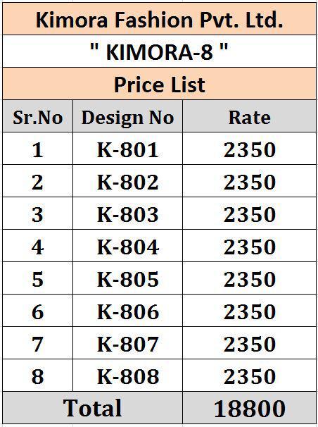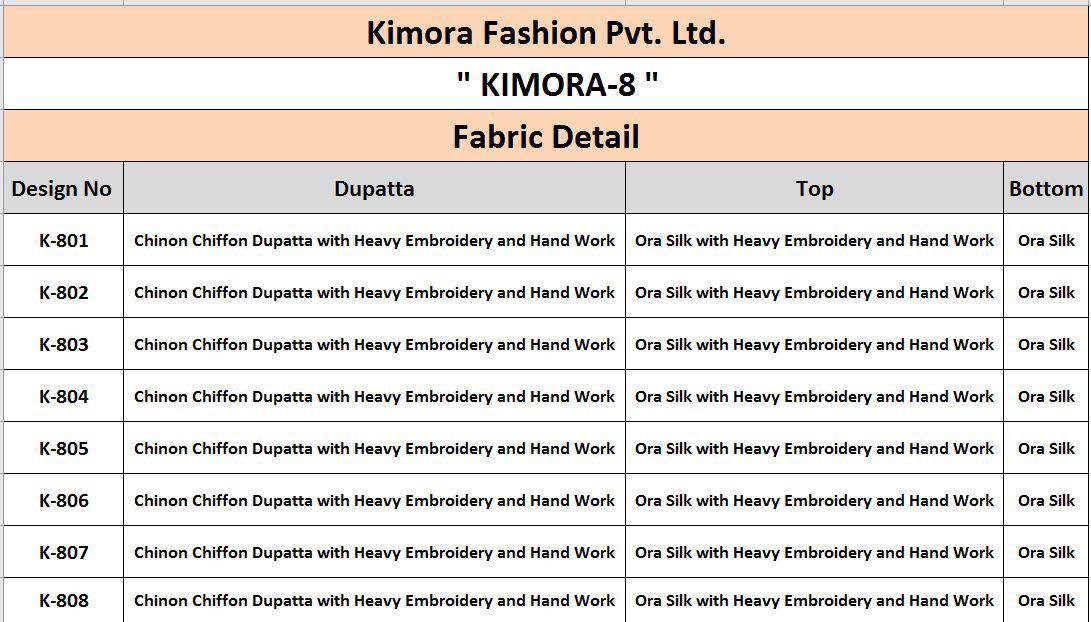 Buy Online Kimora 8 Series K 801 To K 808 Ora Silk Embroidered Designer Party Wear Suits Wholesale Supplier Gujarat 8 Pcs of Full Catalogue at Wholesale Price. Looking for Kimora 8 Series K 801 To K 808 Ora Silk Embroidered Designer Party Wear Suits Wholesale Supplier Gujarat Full Catalouge at Best Price? Buy Now Kimora 8 Series K 801 To K 808 Ora Silk Embroidered Designer Party Wear Suits Wholesale Supplier Gujarat at Wholesale Rate of Rs 18800 with Total 8 Pcs from authroized dealer and supplier of KIMORA Brand. Cost of Each piece is just only Rs 2350 which is very low and affordable price to resale the product in your retail store ,This is Surat based Wholesale Supplier & Dealer of KIMORA Brand. Click on Brand name to Know more about KIMORA Brand's products.Call or Whatsapp on 9898838984 for booking or enquiry