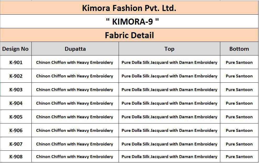Buy Online Kimora 9 Series 901 To 908 Designer Party Wear Suits Wholesale Supplier Gujarat 8 Pcs of Full Catalogue at Wholesale Price. Looking for Kimora 9 Series 901 To 908 Designer Party Wear Suits Wholesale Supplier Gujarat Full Catalouge at Best Price? Buy Now Kimora 9 Series 901 To 908 Designer Party Wear Suits Wholesale Supplier Gujarat at Wholesale Rate of Rs 21000 with Total 8 Pcs from authroized dealer and supplier of KIMORA Brand. Cost of Each piece is just only Rs 2625 which is very low and affordable price to resale the product in your retail store ,This is Surat based Wholesale Supplier & Dealer of KIMORA Brand. Click on Brand name to Know more about KIMORA Brand's products.Call or Whatsapp on 9898838984 for booking or enquiry