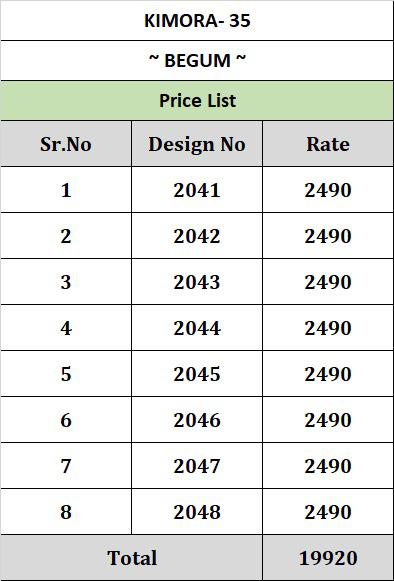Buy Online Kimora Begum Collection 8 Pcs of Full Catalogue at Wholesale Price. Looking for Kimora Begum Collection Full Catalouge at Best Price? Buy Now Kimora Begum Collection at Wholesale Rate of Rs 19920 with Total 8 Pcs from authroized dealer and supplier of KIMORA Brand. Cost of Each piece is just only Rs 2490 which is very low and affordable price to resale the product in your retail store ,This is Surat based Wholesale Supplier & Dealer of KIMORA Brand. Click on Brand name to Know more about KIMORA Brand's products.Call or Whatsapp on 9898838984 for booking or enquiry