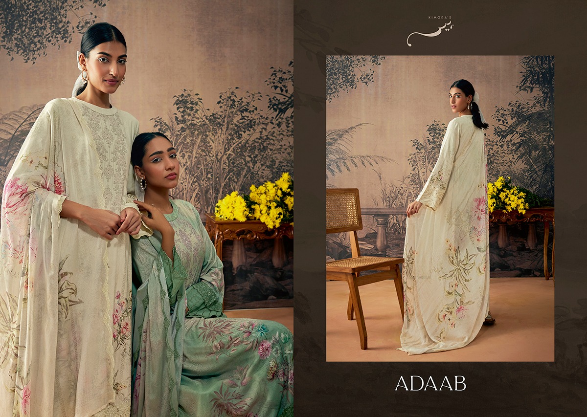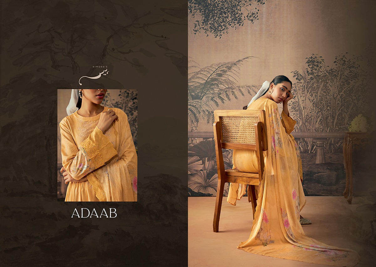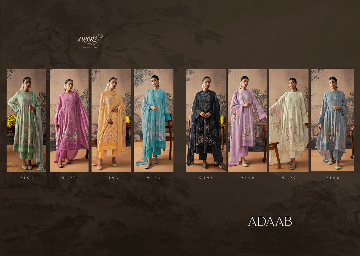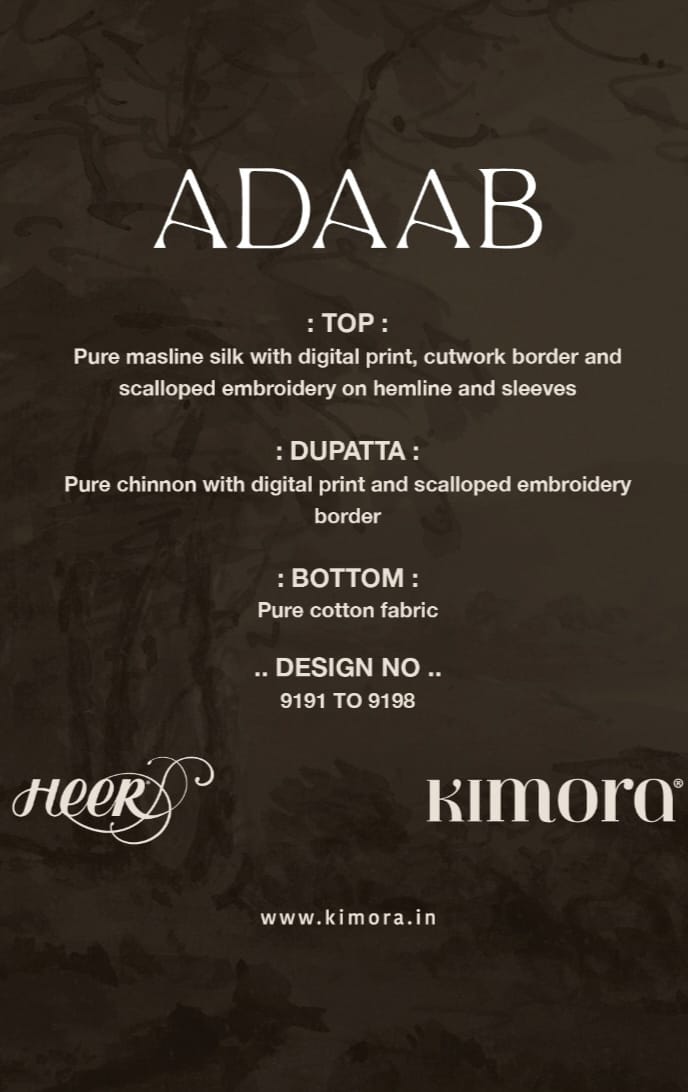 Buy Online Kimora Heer New Launching Adaab Muslin Silk Digital Print Suits 8 Pcs of Full Catalogue at Wholesale Price. Looking for Kimora Heer New Launching Adaab Muslin Silk Digital Print Suits Full Catalouge at Best Price? Buy Now Kimora Heer New Launching Adaab Muslin Silk Digital Print Suits at Wholesale Rate of Rs 15960 with Total 8 Pcs from authroized dealer and supplier of KIMORA Brand. Cost of Each piece is just only Rs 1995 which is very low and affordable price to resale the product in your retail store ,This is Surat based Wholesale Supplier & Dealer of KIMORA Brand. Click on Brand name to Know more about KIMORA Brand's products.Call or Whatsapp on 9898838984 for booking or enquiry