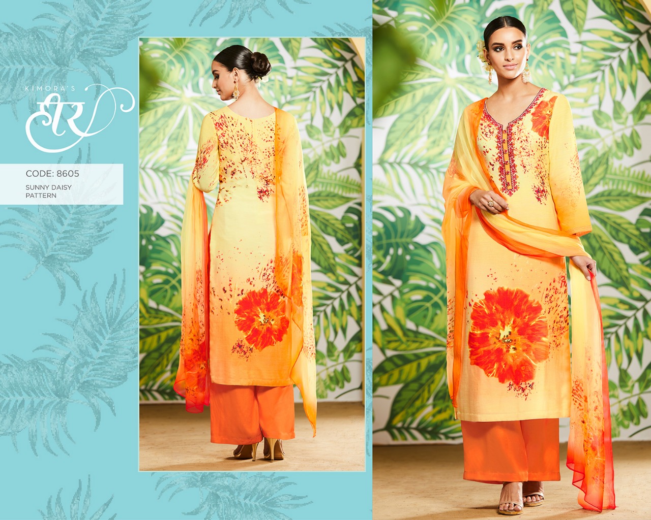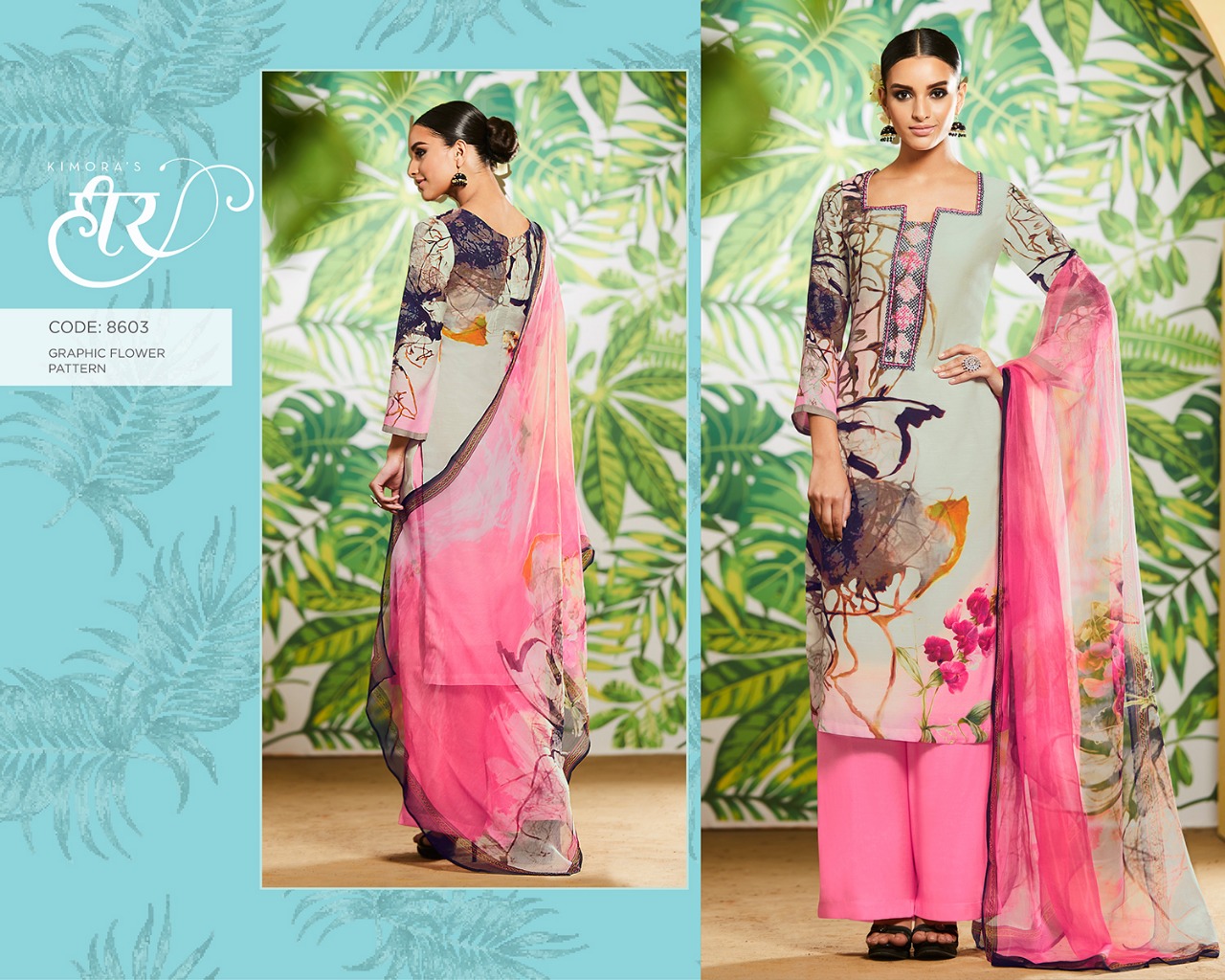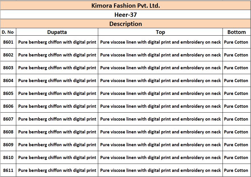 Buy Online Kimora Heer Vol 37 8601 Series Pure Linen Digital Print Suit 0 Pcs of Full Catalogue at Wholesale Price. Looking for Kimora Heer Vol 37 8601 Series Pure Linen Digital Print Suit Full Catalouge at Best Price? Buy Now Kimora Heer Vol 37 8601 Series Pure Linen Digital Print Suit at Wholesale Rate of Rs 0 with Total 0 Pcs from authroized dealer and supplier of KIMORA Brand. Cost of Each piece is just only Rs 1650 which is very low and affordable price to resale the product in your retail store ,This is Surat based Wholesale Supplier & Dealer of KIMORA Brand. Click on Brand name to Know more about KIMORA Brand's products.Call or Whatsapp on 9898838984 for booking or enquiry