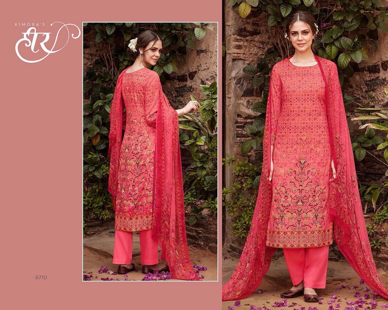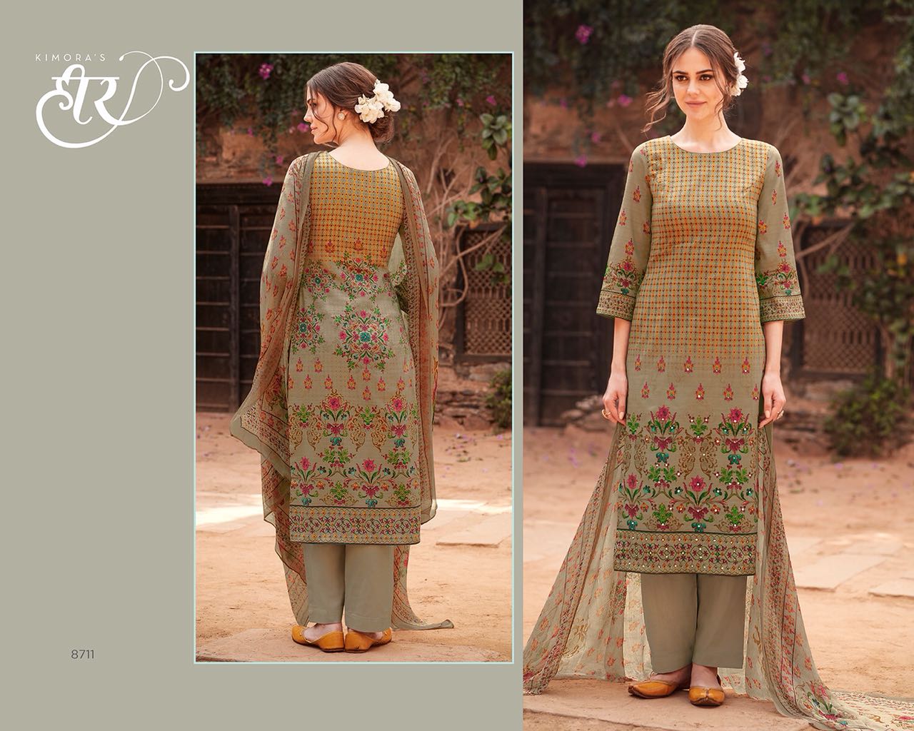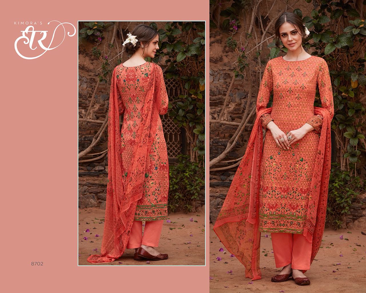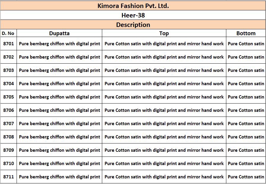Buy Online Kimora Heer Vol 38 8701 Series Satin Print Suit Collection 11 Pcs of Full Catalogue at Wholesale Price. Looking for Kimora Heer Vol 38 8701 Series Satin Print Suit Collection Full Catalouge at Best Price? Buy Now Kimora Heer Vol 38 8701 Series Satin Print Suit Collection at Wholesale Rate of Rs 17545 with Total 11 Pcs from authroized dealer and supplier of KIMORA Brand. Cost of Each piece is just only Rs 1595 which is very low and affordable price to resale the product in your retail store ,This is Surat based Wholesale Supplier & Dealer of KIMORA Brand. Click on Brand name to Know more about KIMORA Brand's products.Call or Whatsapp on 9898838984 for booking or enquiry