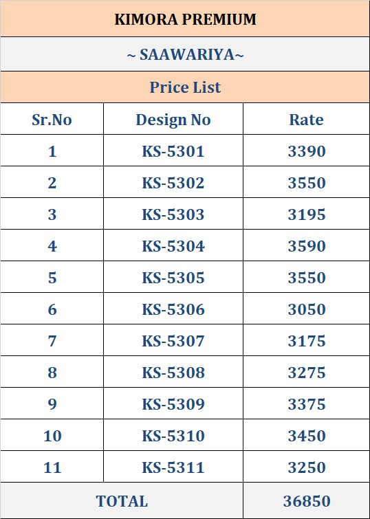 Buy Online Kimora Premium New Launching Saawariya Designer Wedding Session Manufacturing Surat 11 Pcs of Full Catalogue at Wholesale Price. Looking for Kimora Premium New Launching Saawariya Designer Wedding Session Manufacturing Surat Full Catalouge at Best Price? Buy Now Kimora Premium New Launching Saawariya Designer Wedding Session Manufacturing Surat at Wholesale Rate of Rs 0 with Total 11 Pcs from authroized dealer and supplier of KIMORA Brand. Cost of Each piece is just only Rs 0 which is very low and affordable price to resale the product in your retail store ,This is Surat based Wholesale Supplier & Dealer of KIMORA Brand. Click on Brand name to Know more about KIMORA Brand's products.Call or Whatsapp on 9898838984 for booking or enquiry