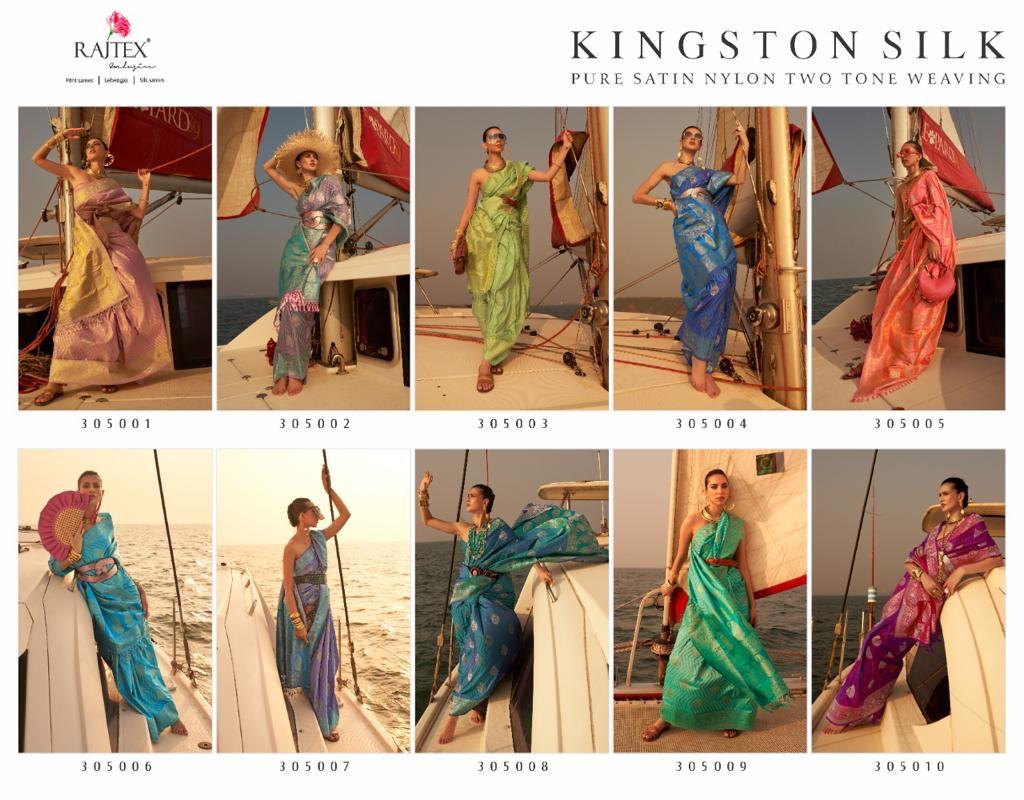 Buy Online Kingston Silk By Rajtex Fabrics Pure Satin Nylon Two Tone Weaving Sarees 10 Pcs of Full Catalogue at Wholesale Price. Looking for Kingston Silk By Rajtex Fabrics Pure Satin Nylon Two Tone Weaving Sarees Full Catalouge at Best Price? Buy Now Kingston Silk By Rajtex Fabrics Pure Satin Nylon Two Tone Weaving Sarees at Wholesale Rate of Rs 19950 with Total 10 Pcs from authroized dealer and supplier of RAJTEX Brand. Cost of Each piece is just only Rs 1995 which is very low and affordable price to resale the product in your retail store ,This is Surat based Wholesale Supplier & Dealer of RAJTEX Brand. Click on Brand name to Know more about RAJTEX Brand's products.Call or Whatsapp on 9898838984 for booking or enquiry