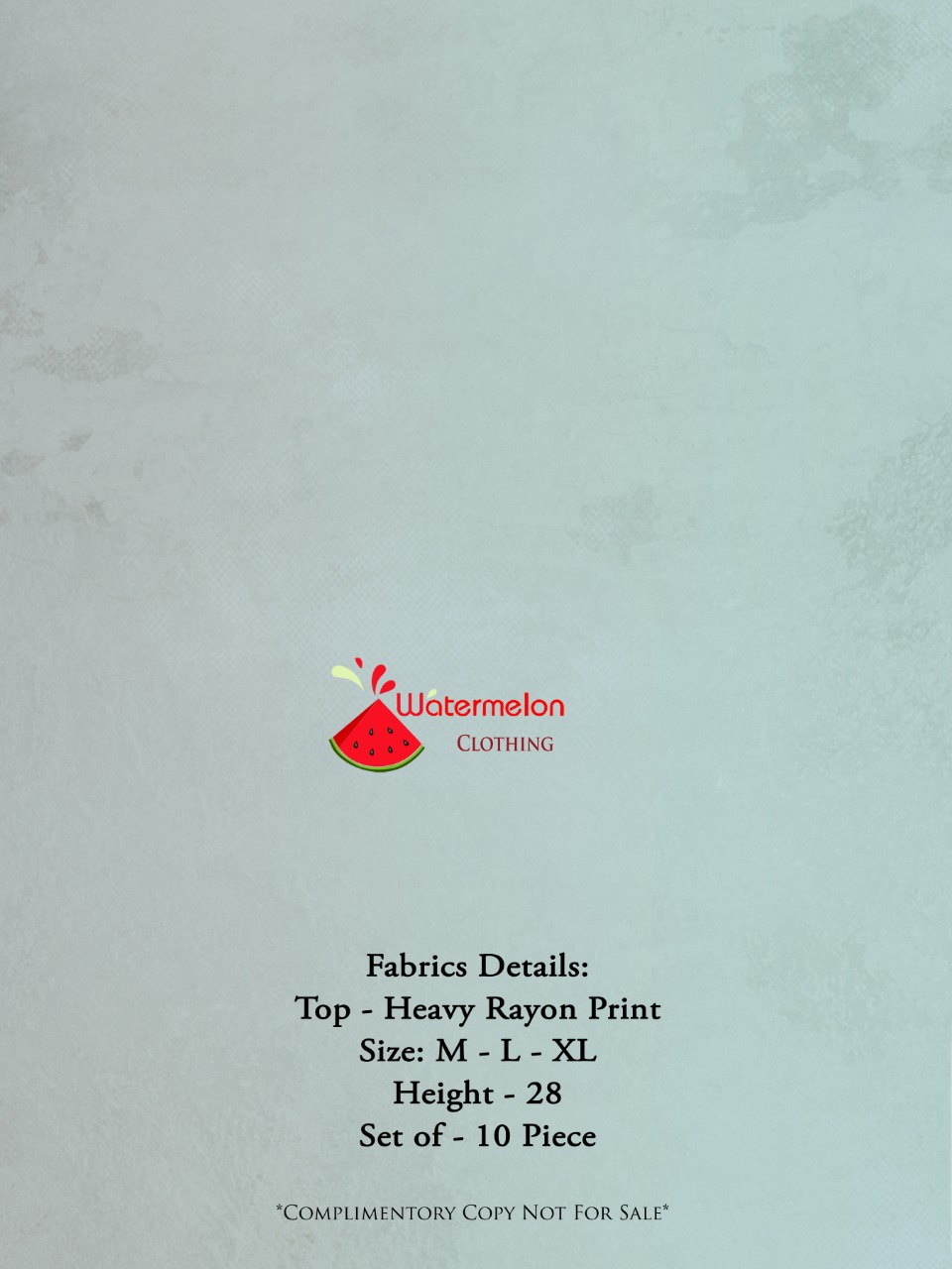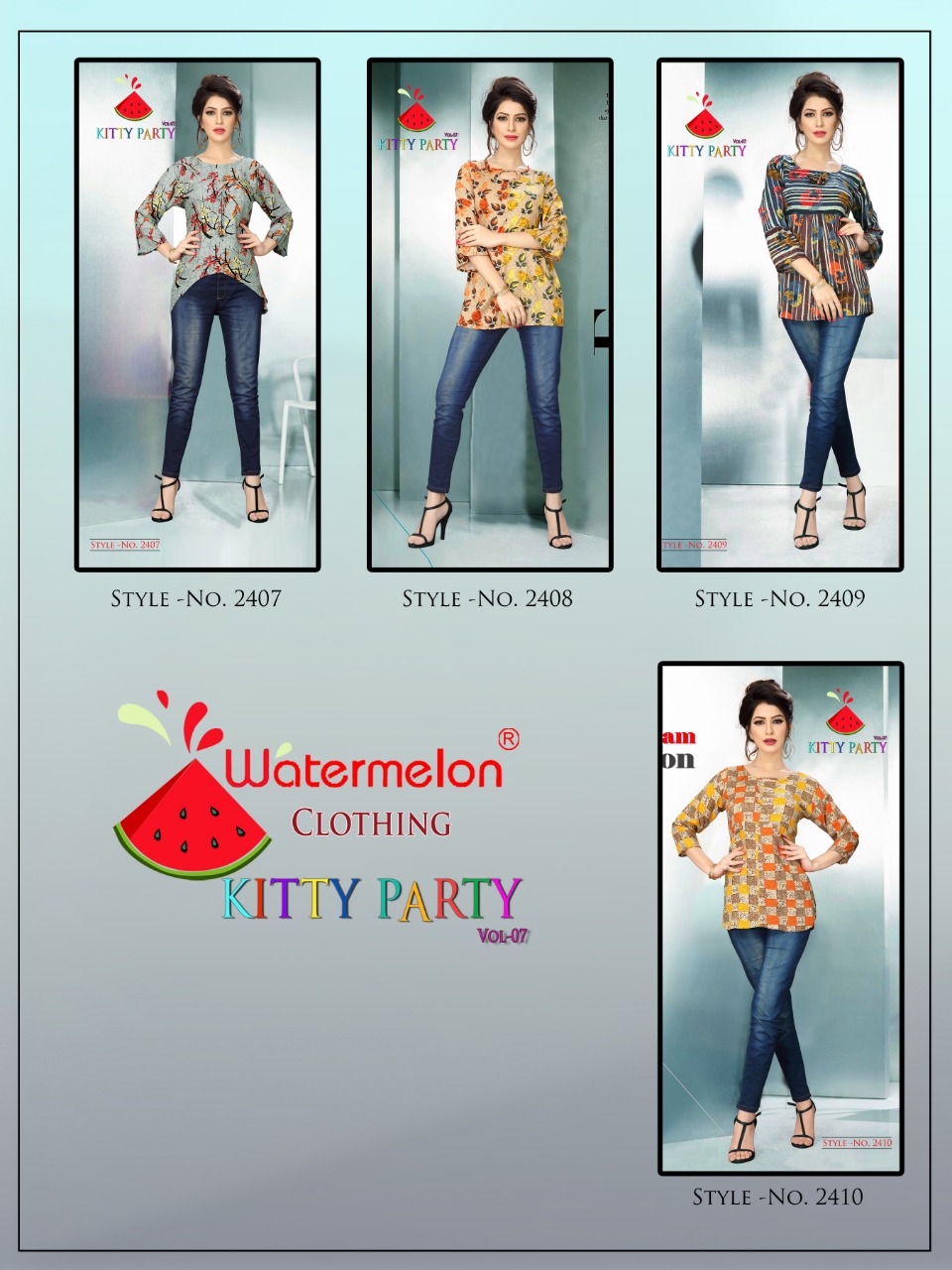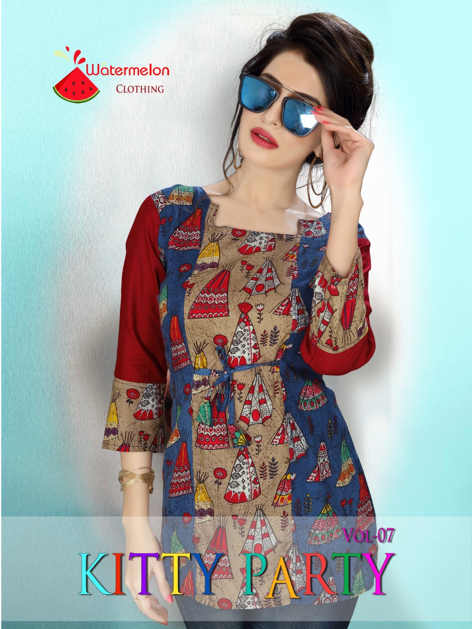 Buy Online Kitty Party Vol 7 By Watermelon Reyon Printed Tops Wholesale Supplier Gujarat 10 Pcs of Full Catalogue at Wholesale Price. Looking for Kitty Party Vol 7 By Watermelon Reyon Printed Tops Wholesale Supplier Gujarat Full Catalouge at Best Price? Buy Now Kitty Party Vol 7 By Watermelon Reyon Printed Tops Wholesale Supplier Gujarat at Wholesale Rate of Rs 3250 with Total 10 Pcs from authroized dealer and supplier of WATERMELON Brand. Cost of Each piece is just only Rs 325 which is very low and affordable price to resale the product in your retail store ,This is Surat based Wholesale Supplier & Dealer of WATERMELON Brand. Click on Brand name to Know more about WATERMELON Brand's products.Call or Whatsapp on 9898838984 for booking or enquiry