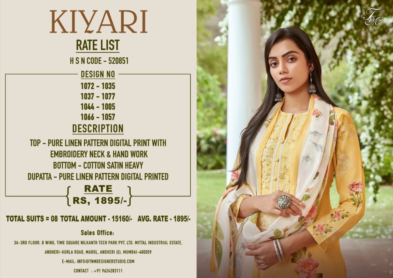 Buy Online Kiyari By T And M Wholesaler Supplier From Surat 8 Pcs of Full Catalogue at Wholesale Price. Looking for Kiyari By T And M Wholesaler Supplier From Surat Full Catalouge at Best Price? Buy Now Kiyari By T And M Wholesaler Supplier From Surat at Wholesale Rate of Rs 15160 with Total 8 Pcs from authroized dealer and supplier of Brand. Cost of Each piece is just only Rs 1895 which is very low and affordable price to resale the product in your retail store ,This is Surat based Wholesale Supplier & Dealer of Brand. Click on Brand name to Know more about Brand's products.Call or Whatsapp on 9898838984 for booking or enquiry