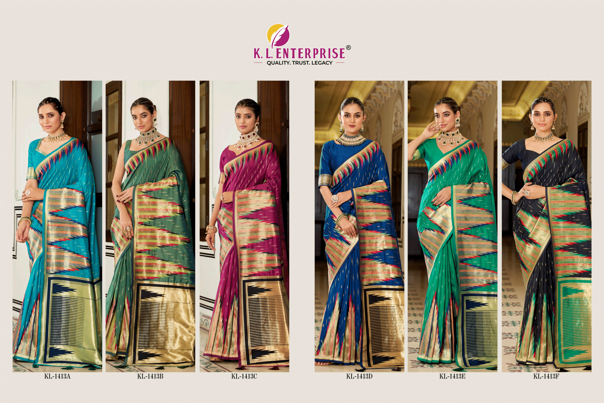 Buy Online Kl New Catalog Varkala 1413a To 1413f Silk Saree 6 Pcs of Full Catalogue at Wholesale Price. Looking for Kl New Catalog Varkala 1413a To 1413f Silk Saree Full Catalouge at Best Price? Buy Now Kl New Catalog Varkala 1413a To 1413f Silk Saree at Wholesale Rate of Rs 9870 with Total 6 Pcs from authroized dealer and supplier of KL ENTERPRISE Brand. Cost of Each piece is just only Rs 1645 which is very low and affordable price to resale the product in your retail store ,This is Surat based Wholesale Supplier & Dealer of KL ENTERPRISE Brand. Click on Brand name to Know more about KL ENTERPRISE Brand's products.Call or Whatsapp on 9898838984 for booking or enquiry