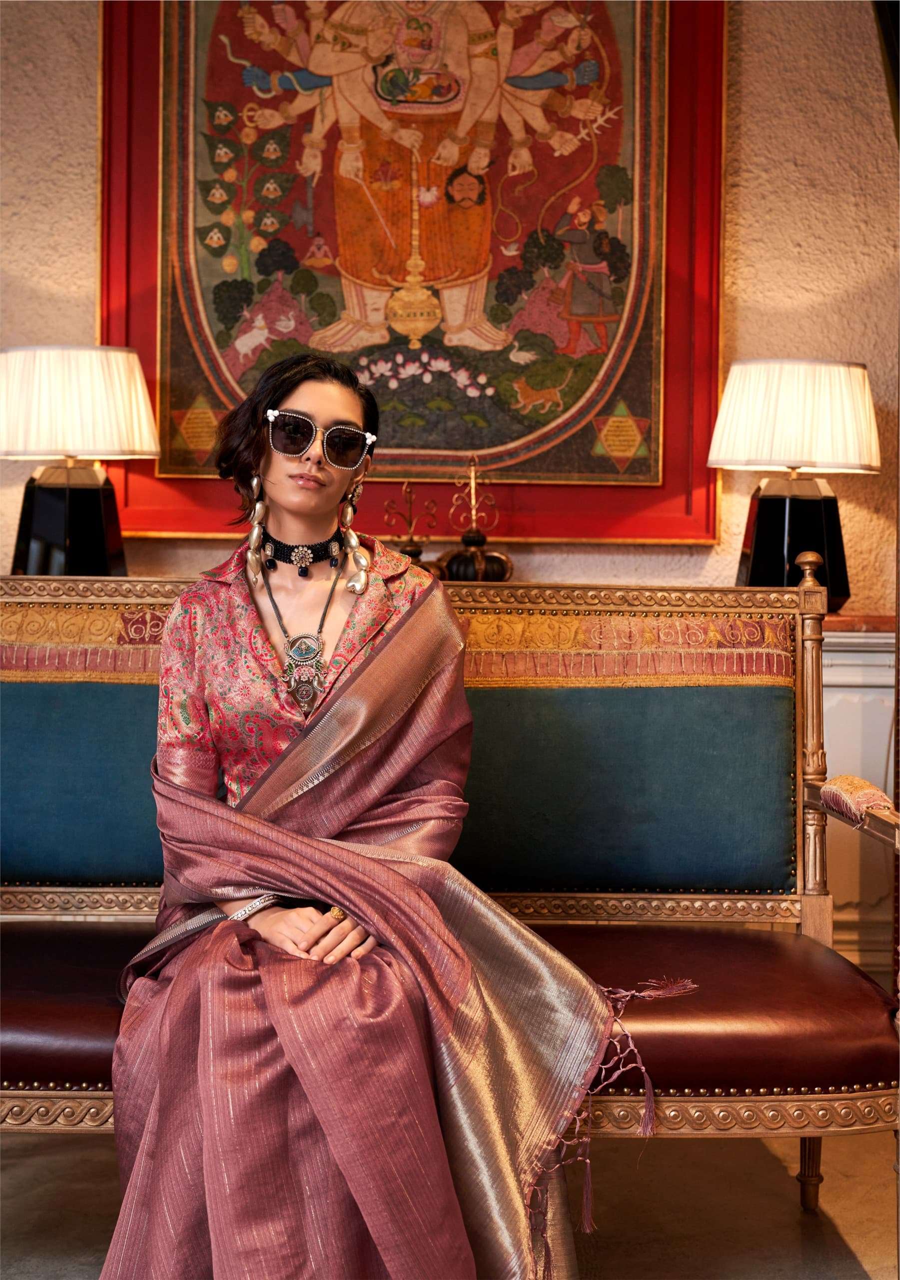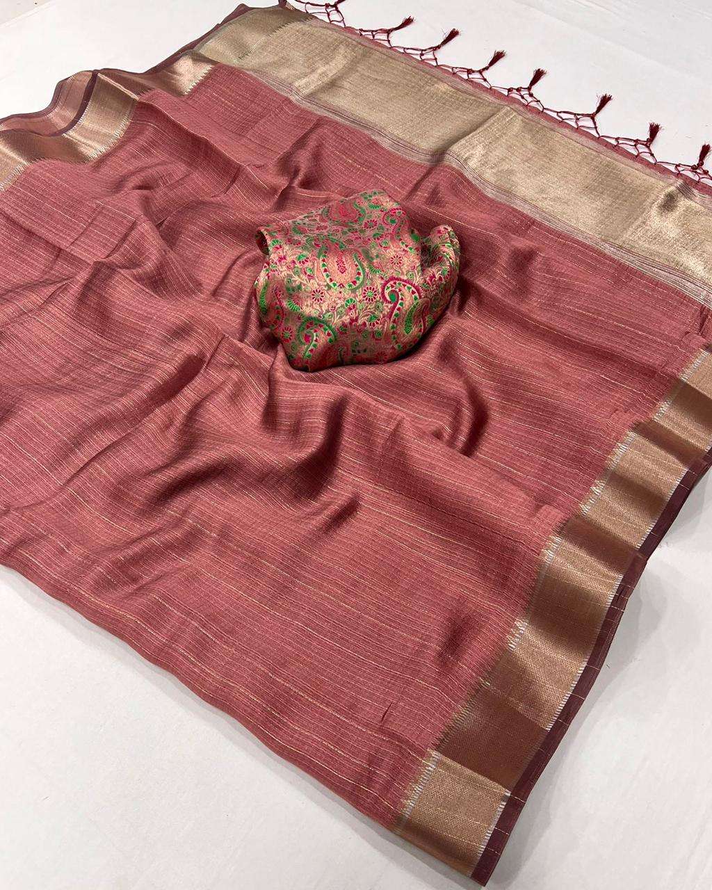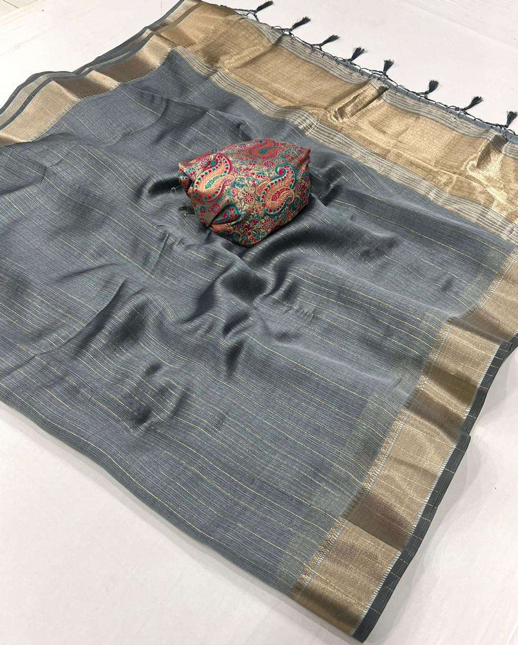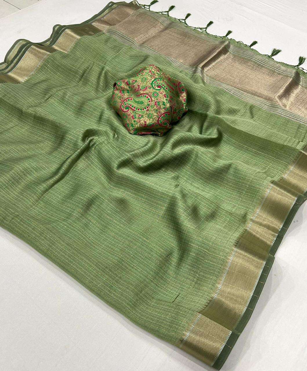 *Saree Fabric : Moss Chiffon Handloom Weaving border & all over Zari Lining Contrast Pallu*