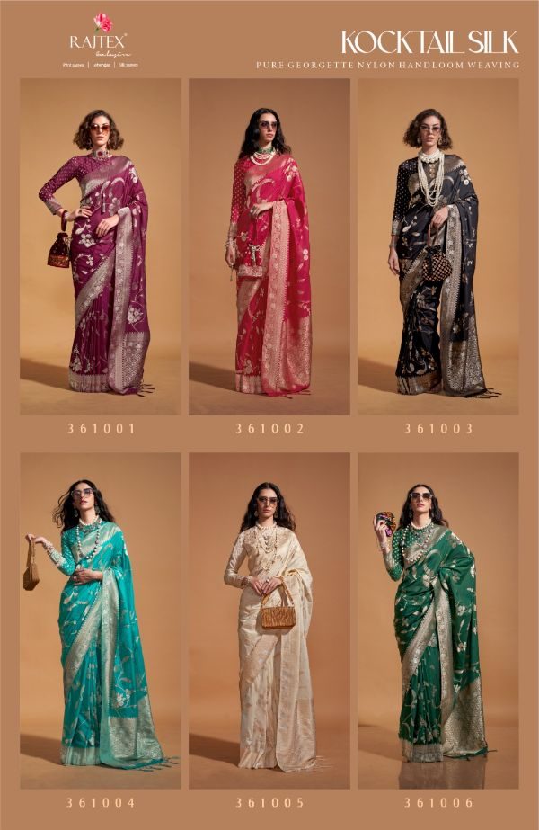 Buy Online Kocktail Silk Series 361001 To 361006 By Rajtex 6 Pcs of Full Catalogue at Wholesale Price. Looking for Kocktail Silk Series 361001 To 361006 By Rajtex Full Catalouge at Best Price? Buy Now Kocktail Silk Series 361001 To 361006 By Rajtex at Wholesale Rate of Rs 11970 with Total 6 Pcs from authroized dealer and supplier of Brand. Cost of Each piece is just only Rs 1995 which is very low and affordable price to resale the product in your retail store ,This is Surat based Wholesale Supplier & Dealer of Brand. Click on Brand name to Know more about Brand's products.Call or Whatsapp on 9898838984 for booking or enquiry