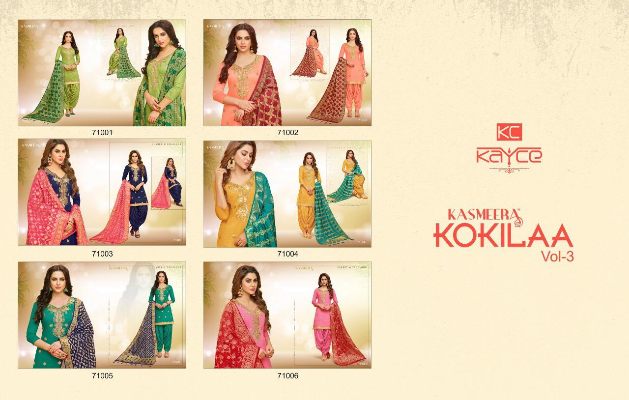 Buy Online Kokilaa Vol 3 By Kasmeera 71001 Series Fancy Modal Silk Patiala Suit Collection Wholesale Dealer Surat 6 Pcs of Full Catalogue at Wholesale Price. Looking for Kokilaa Vol 3 By Kasmeera 71001 Series Fancy Modal Silk Patiala Suit Collection Wholesale Dealer Surat Full Catalouge at Best Price? Buy Now Kokilaa Vol 3 By Kasmeera 71001 Series Fancy Modal Silk Patiala Suit Collection Wholesale Dealer Surat at Wholesale Rate of Rs 5994 with Total 6 Pcs from authroized dealer and supplier of Kasmeera Brand. Cost of Each piece is just only Rs 999 which is very low and affordable price to resale the product in your retail store ,This is Surat based Wholesale Supplier & Dealer of Kasmeera Brand. Click on Brand name to Know more about Kasmeera Brand's products.Call or Whatsapp on 9898838984 for booking or enquiry