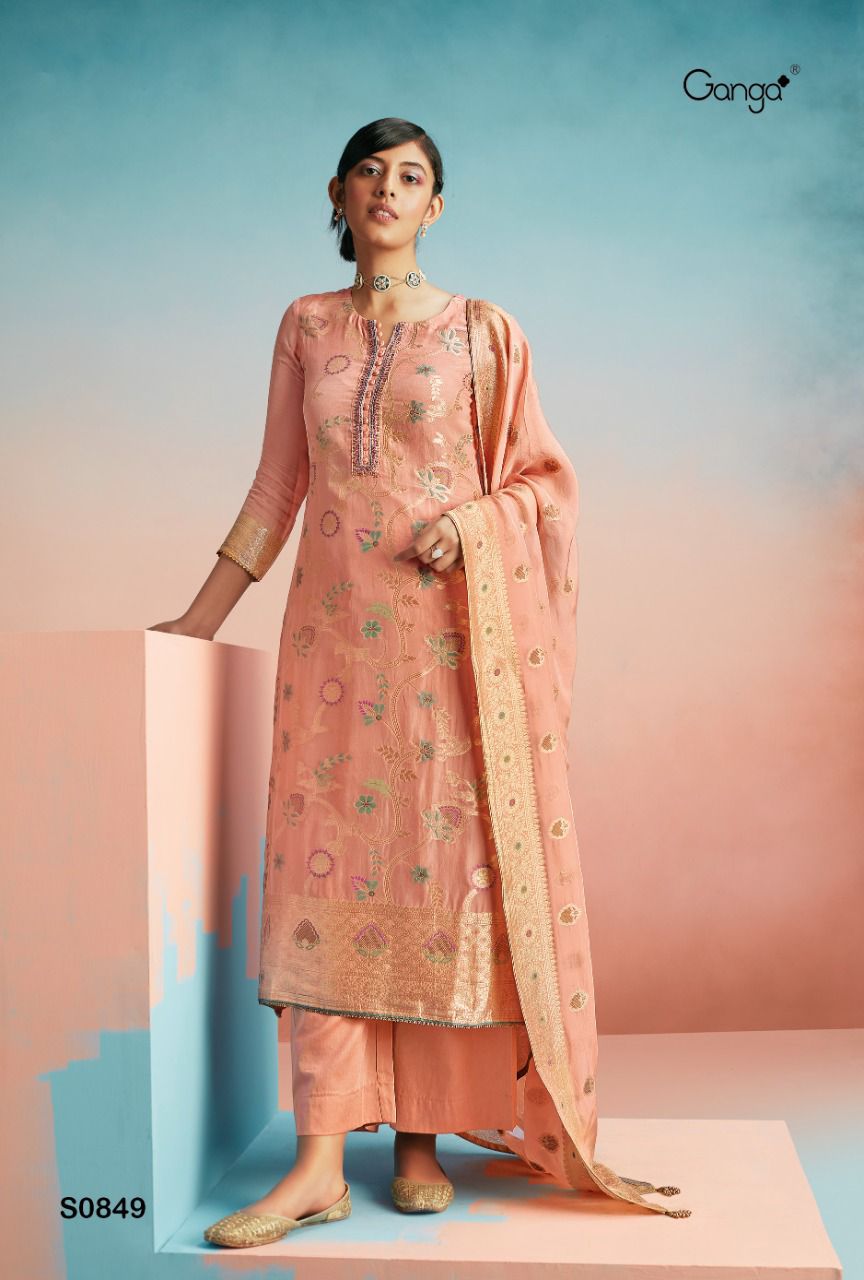 *GANGA* KRISHA 849 *TOP:* PREMIUM ORGANZA JACQUARD WITH HANDWORK *BOTTOM:* PREMIUM COTTON SATIN SOLID *DUPATTA:* PREMIUM ORGANZA JACQUARD WITH JACQUARD BORDER AND TASSEL |
