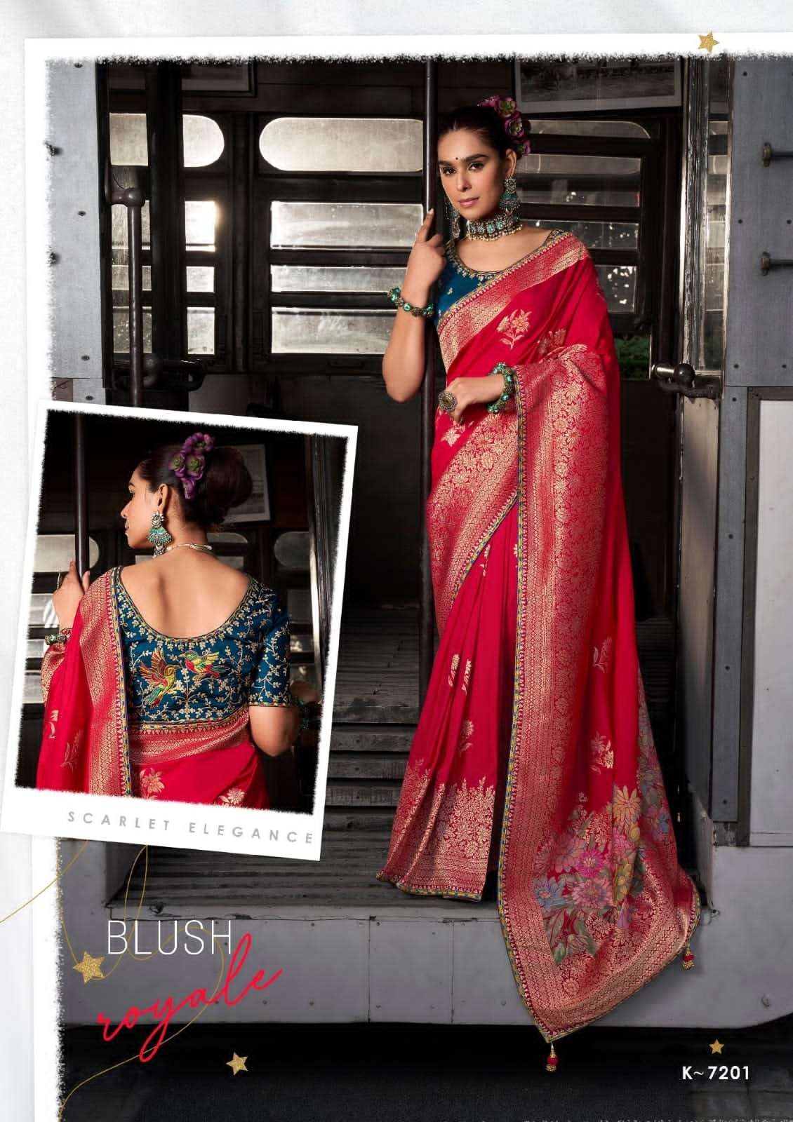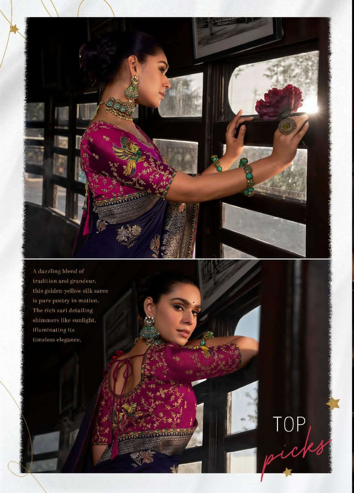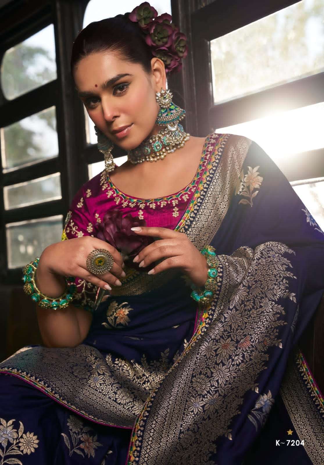 ➡️Catalog - *Krisha* ➡️Rate - *2895+5%* ➡️Fabric - *Soft Dola Viscous Silk with 3d Weaved Pallu & Fancy Lace Border Also with Heavy Embroidered Contrast Blouse*