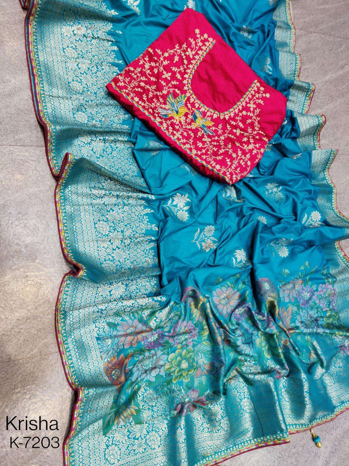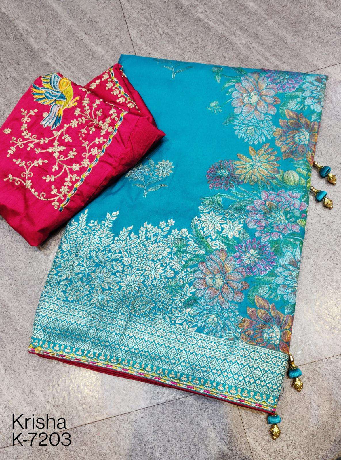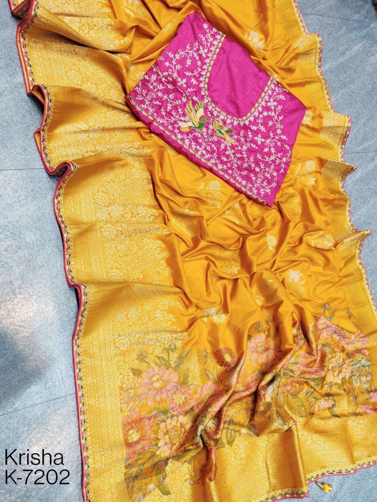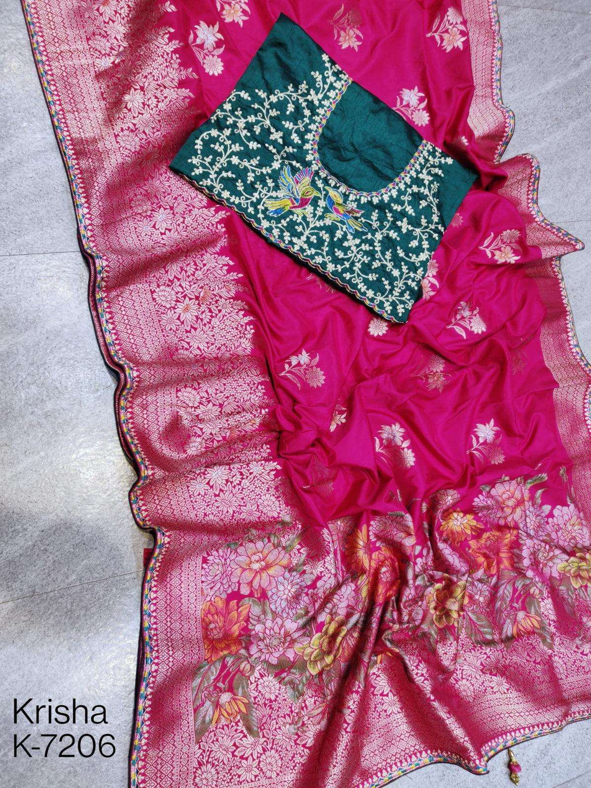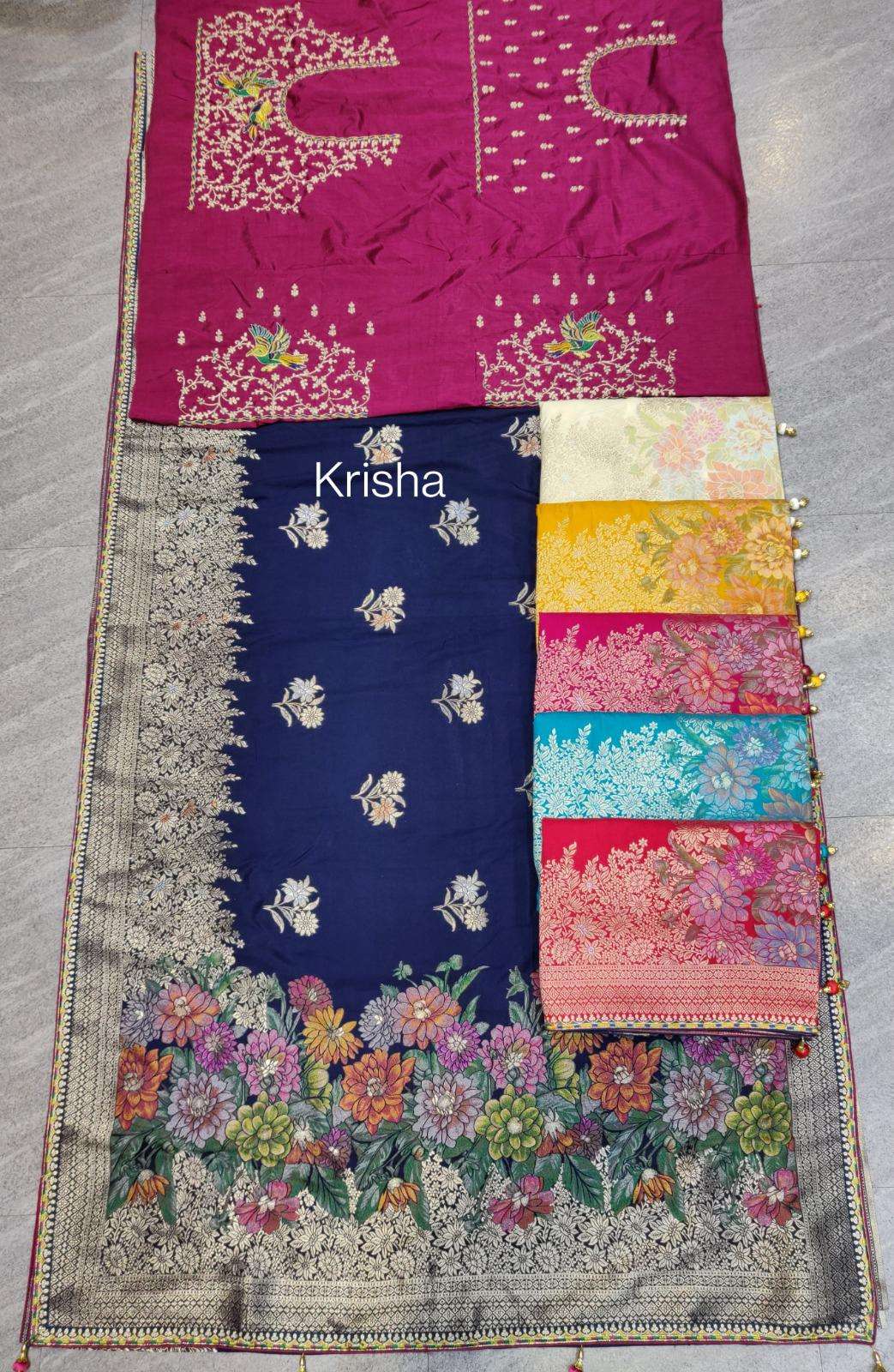 *Krisha Saree 🌟* - *Catalog:* Krisha - *Rate:* ₹2895 + 5% - *Fabric:* Soft Dola Viscous Silk with: - 3D Weaved Pallu - Fancy Lace Border - Heavy Embroidered Contrast Blouse - *Availability:* Singles available |