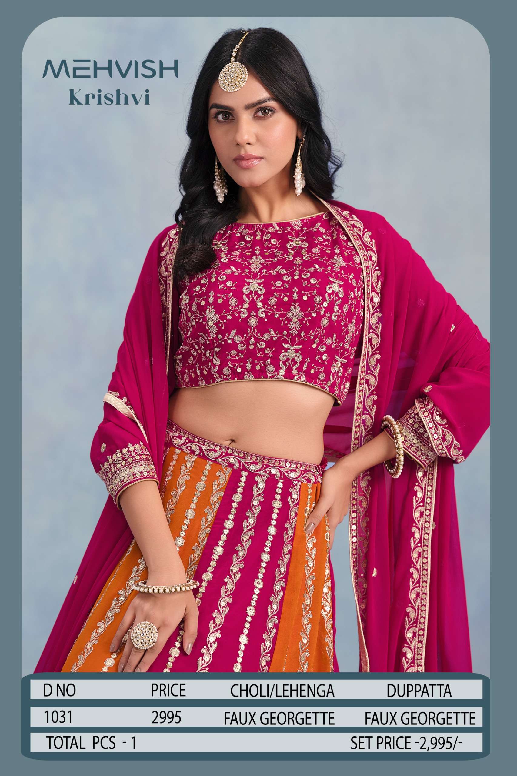 Buy Online KRISHVI BY MEHVISH Faux georgette lehenga choli collection manufacturer surat 1 Pcs of Full Catalogue at Wholesale Price. Looking for KRISHVI BY MEHVISH Faux georgette lehenga choli collection manufacturer surat Full Catalouge at Best Price? Buy Now KRISHVI BY MEHVISH Faux georgette lehenga choli collection manufacturer surat at Wholesale Rate of Rs 2995 with Total 1 Pcs from authroized dealer and supplier of BRAND'S Brand. Cost of Each piece is just only Rs 2995 which is very low and affordable price to resale the product in your retail store ,This is Surat based Wholesale Supplier & Dealer of BRAND'S Brand. Click on Brand name to Know more about BRAND'S Brand's products.Call or Whatsapp on 9898838984 for booking or enquiry