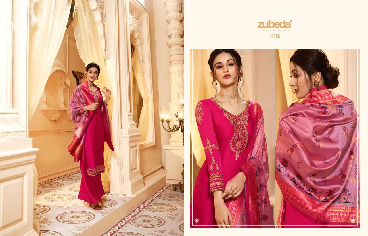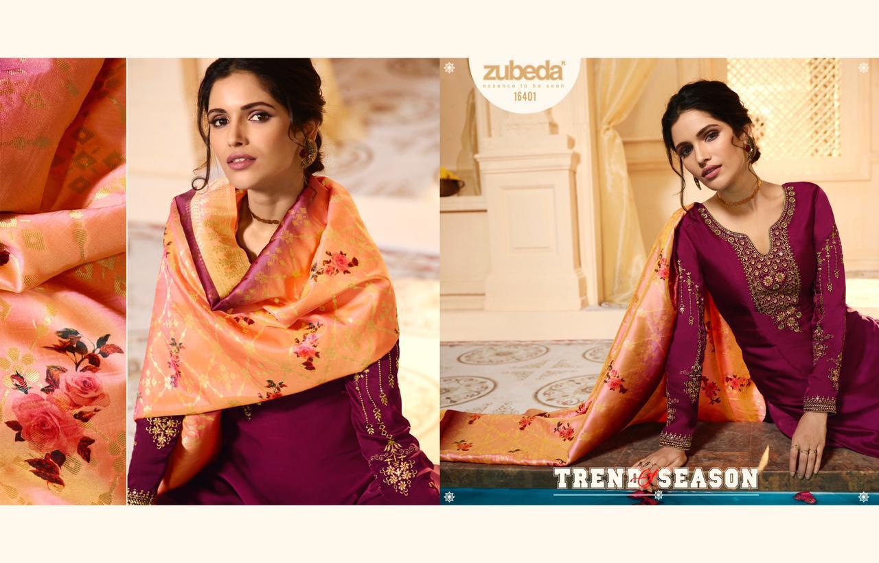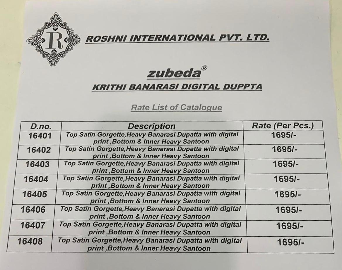 Buy Online Krithi Banarasi Digital Dupatta By Zubeda Series 16401 To 16408 Satin Georgette Embroidered Designer Party Wear Suits Wholesale Supplier Gujarat 8 Pcs of Full Catalogue at Wholesale Price. Looking for Krithi Banarasi Digital Dupatta By Zubeda Series 16401 To 16408 Satin Georgette Embroidered Designer Party Wear Suits Wholesale Supplier Gujarat Full Catalouge at Best Price? Buy Now Krithi Banarasi Digital Dupatta By Zubeda Series 16401 To 16408 Satin Georgette Embroidered Designer Party Wear Suits Wholesale Supplier Gujarat at Wholesale Rate of Rs 13560 with Total 8 Pcs from authroized dealer and supplier of ZUBEDA Brand. Cost of Each piece is just only Rs 1695 which is very low and affordable price to resale the product in your retail store ,This is Surat based Wholesale Supplier & Dealer of ZUBEDA Brand. Click on Brand name to Know more about ZUBEDA Brand's products.Call or Whatsapp on 9898838984 for booking or enquiry