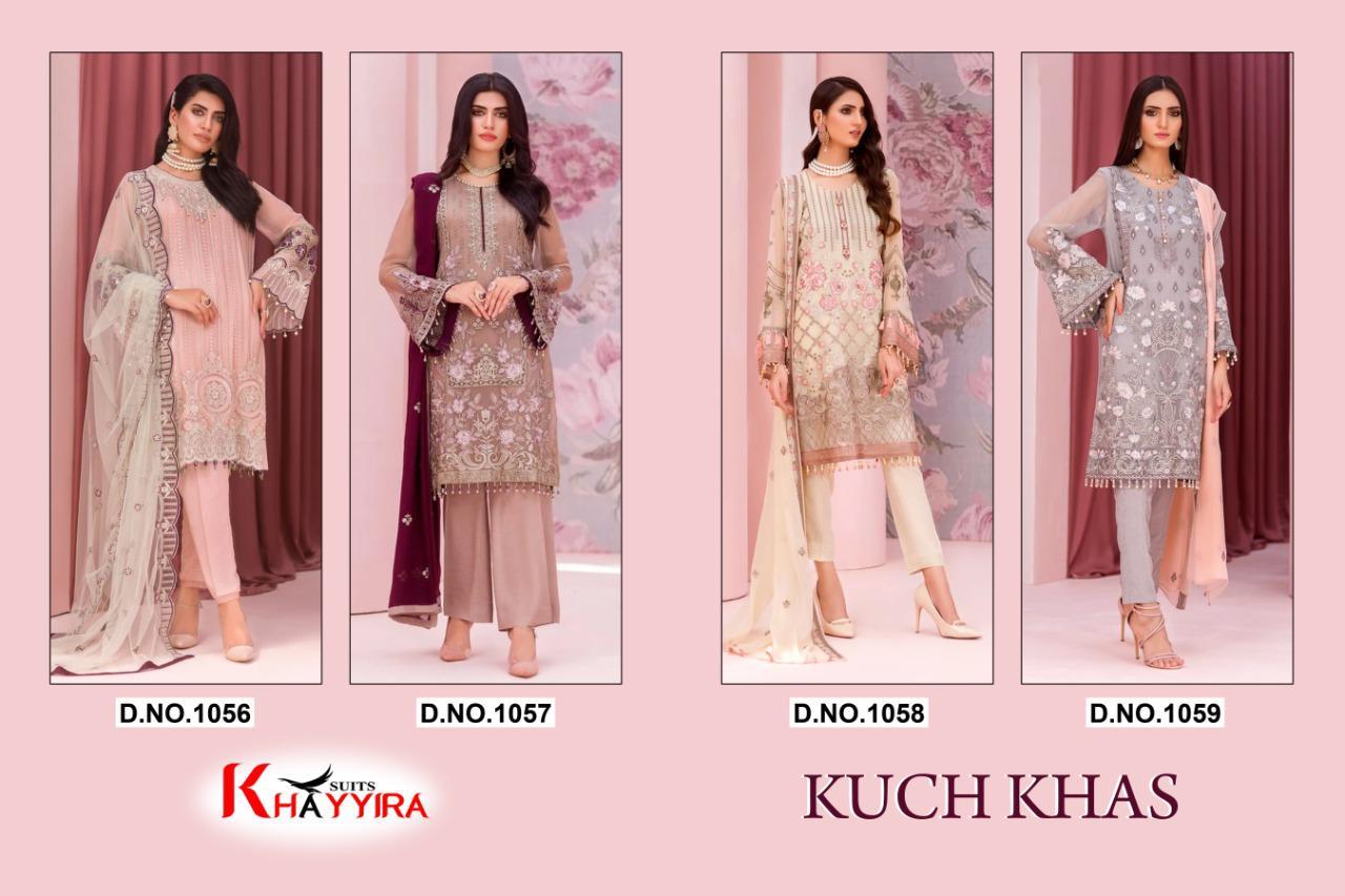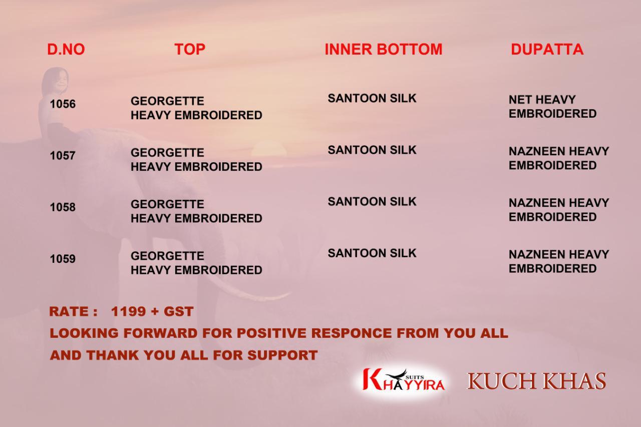 Buy Online Kuch Khas By Khayyira Pakistani Suits Wholesale Supplier And Dealer Gujarat 4 Pcs of Full Catalogue at Wholesale Price. Looking for Kuch Khas By Khayyira Pakistani Suits Wholesale Supplier And Dealer Gujarat Full Catalouge at Best Price? Buy Now Kuch Khas By Khayyira Pakistani Suits Wholesale Supplier And Dealer Gujarat at Wholesale Rate of Rs 4796 with Total 4 Pcs from authroized dealer and supplier of Brand. Cost of Each piece is just only Rs 1199 which is very low and affordable price to resale the product in your retail store ,This is Surat based Wholesale Supplier & Dealer of Brand. Click on Brand name to Know more about Brand's products.Call or Whatsapp on 9898838984 for booking or enquiry