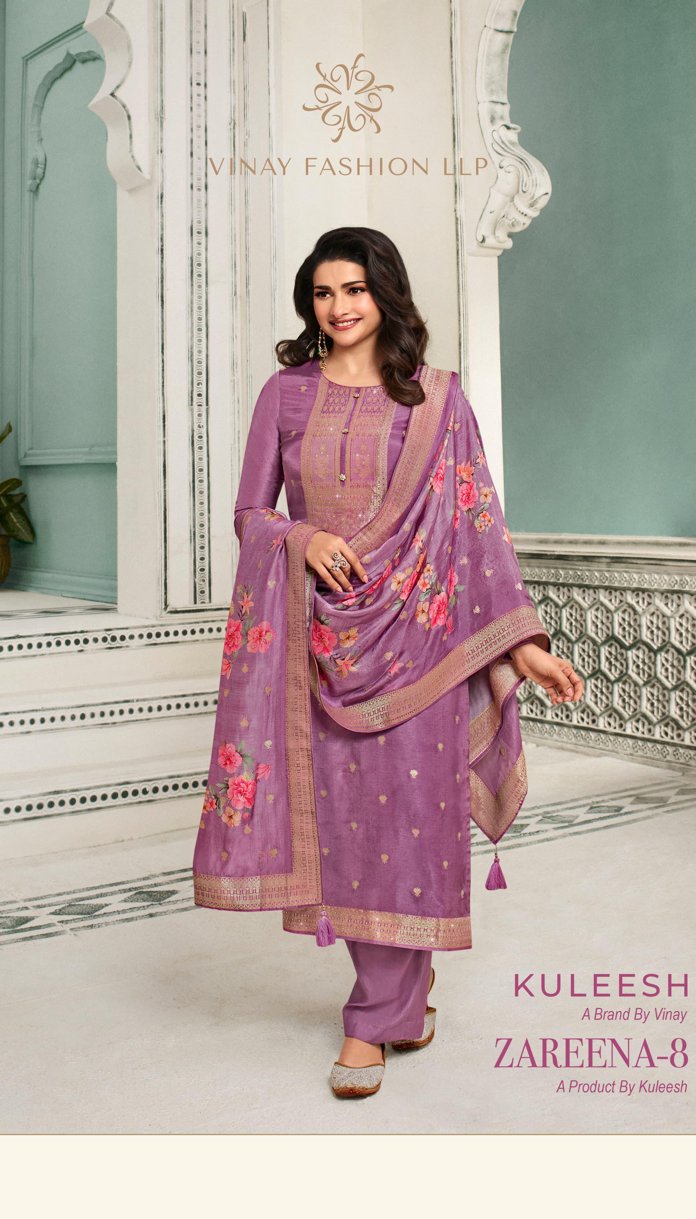 Buy Online Kuleesh Zareena Vol 8 Dola Jacquard Digital Suits 6 Pcs of Full Catalogue at Wholesale Price. Looking for Kuleesh Zareena Vol 8 Dola Jacquard Digital Suits Full Catalouge at Best Price? Buy Now Kuleesh Zareena Vol 8 Dola Jacquard Digital Suits at Wholesale Rate of Rs 12300 with Total 6 Pcs from authroized dealer and supplier of Brand. Cost of Each piece is just only Rs 2050 which is very low and affordable price to resale the product in your retail store ,This is Surat based Wholesale Supplier & Dealer of Brand. Click on Brand name to Know more about Brand's products.Call or Whatsapp on 9898838984 for booking or enquiry