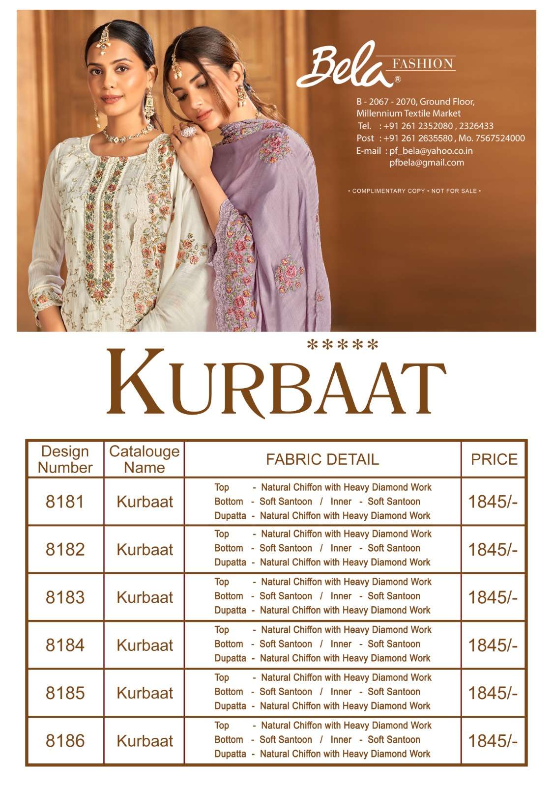 Buy Online KURBAAT by bela fashion chiffon suit collection manufacturer surat 6 Pcs of Full Catalogue at Wholesale Price. Looking for KURBAAT by bela fashion chiffon suit collection manufacturer surat Full Catalouge at Best Price? Buy Now KURBAAT by bela fashion chiffon suit collection manufacturer surat at Wholesale Rate of Rs 11070 with Total 6 Pcs from authroized dealer and supplier of BELA Brand. Cost of Each piece is just only Rs 1845 which is very low and affordable price to resale the product in your retail store ,This is Surat based Wholesale Supplier & Dealer of BELA Brand. Click on Brand name to Know more about BELA Brand's products.Call or Whatsapp on 9898838984 for booking or enquiry