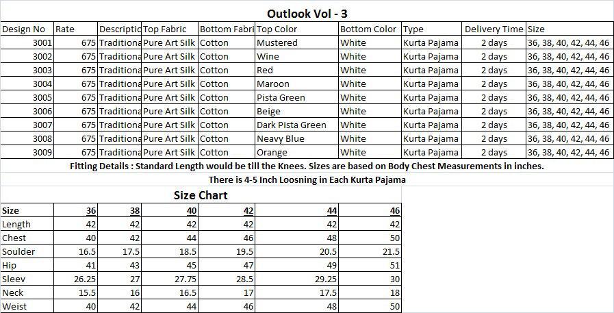 Buy Online Kurta Pajama New Catalog Outlook Vol 3 Single Available Manufacturer Traders Surat 9 Pcs of Full Catalogue at Wholesale Price. Looking for Kurta Pajama New Catalog Outlook Vol 3 Single Available Manufacturer Traders Surat Full Catalouge at Best Price? Buy Now Kurta Pajama New Catalog Outlook Vol 3 Single Available Manufacturer Traders Surat at Wholesale Rate of Rs 6075 with Total 9 Pcs from authroized dealer and supplier of Brand. Cost of Each piece is just only Rs 675 which is very low and affordable price to resale the product in your retail store ,This is Surat based Wholesale Supplier & Dealer of Brand. Click on Brand name to Know more about Brand's products.Call or Whatsapp on 9898838984 for booking or enquiry