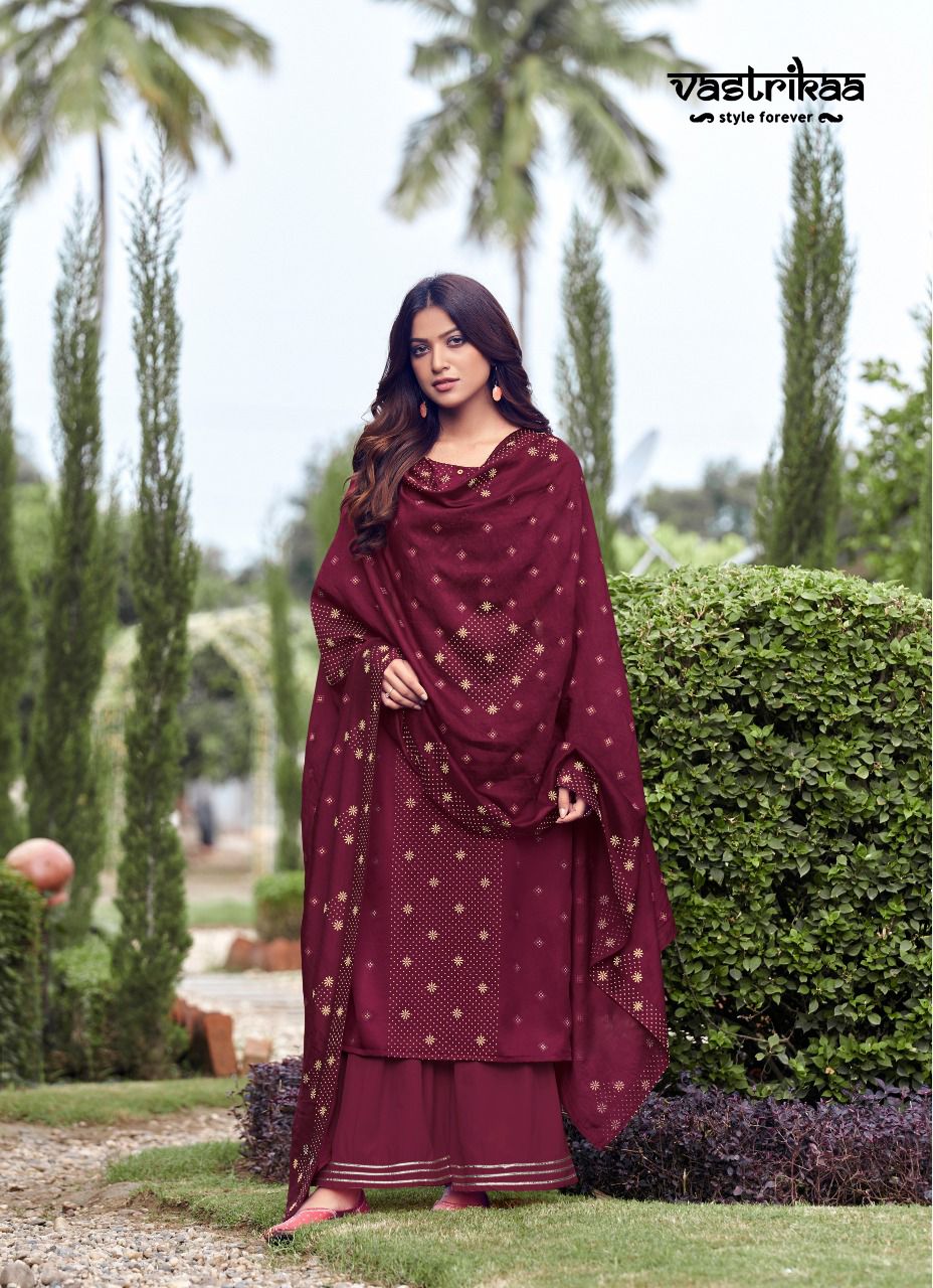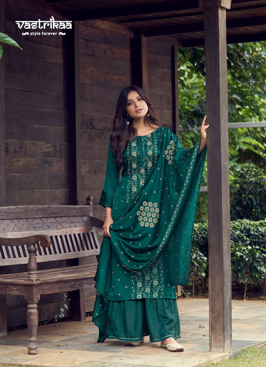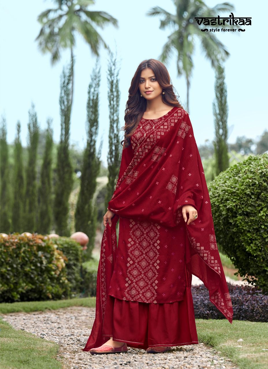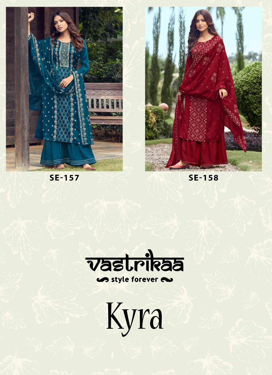 ? *Vastrikaa* Festive Collection _Catalog name_ : *Kyra* ? _Fabric Details_ ? ?Top - Silk with Rubber Print & Handwork ?Bottom - Silky base Sharara ?Dupatta - Silky Base with Rubber Print ?Total Design :- 6 ?Rate:- Rs. 1095/- per Piece + 5% GST Set to set. Delivery 2 days ?Size;- M, L, XL, 2XL, 3XL ?Booking started from now.. ?Dispatching in 2- 3 days... ?Order your's soon with Gst & Transport details.... Thanking You, Team Vastrikaa |