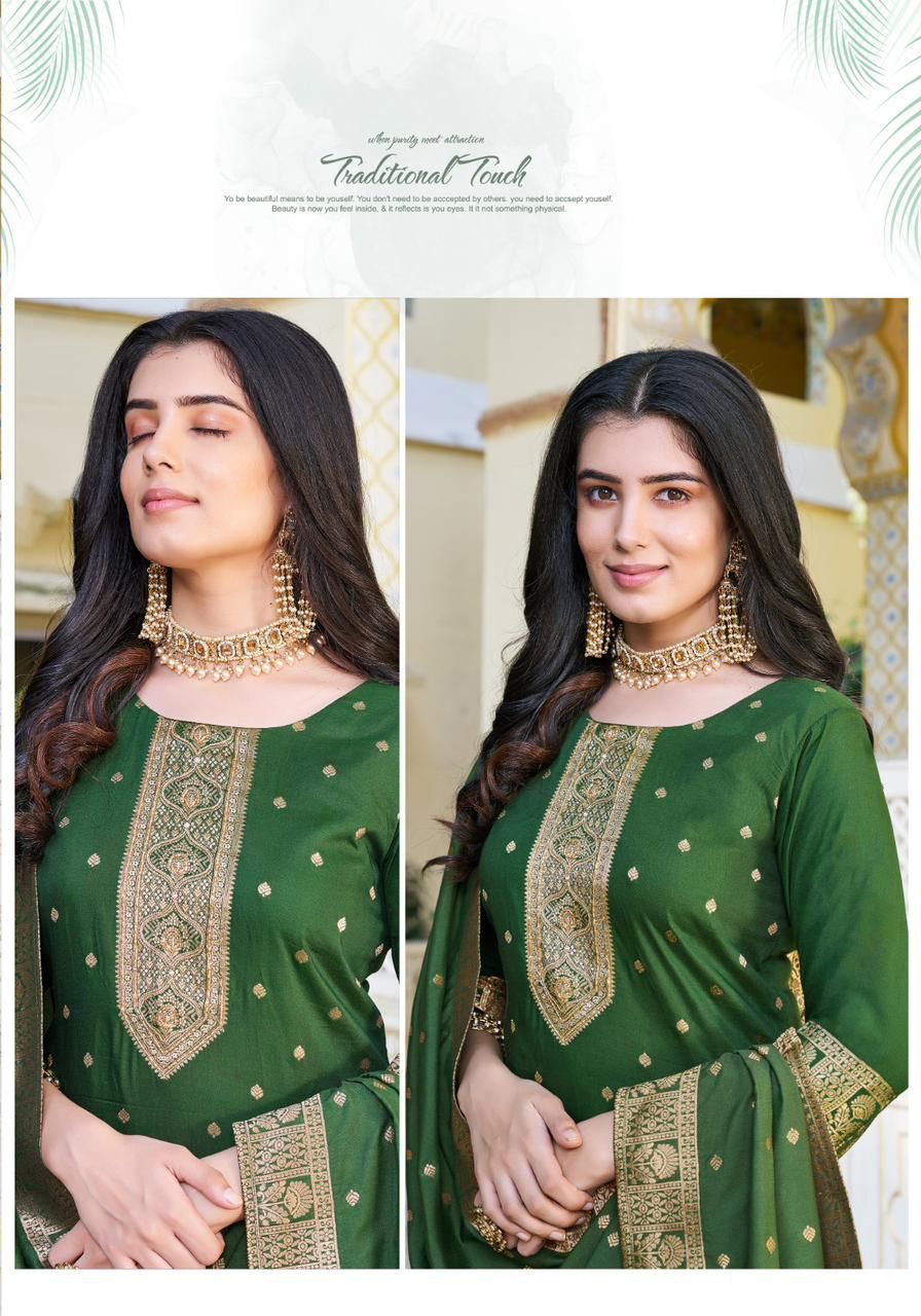 ? *Ladies Flavour*? *Catalog*: *Blossom* *Design*: *4* *Fabric*:-*Chanderi Dolla Jaquard With Pure Khatli Work With Full Inner* (Length :- 42Â?) *Bottom*:- *Heavy Satin Chanderi With lace* *Dupptta* :*Pure Jaquard Dupptta (2.30 cut With 36 Panna)* *Size* : *M(38), L(40), XL(42), 2XL(44), 3XL(46)* Dispatch Next Week 100+single |