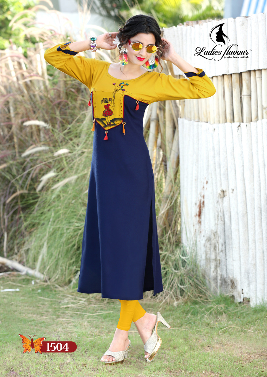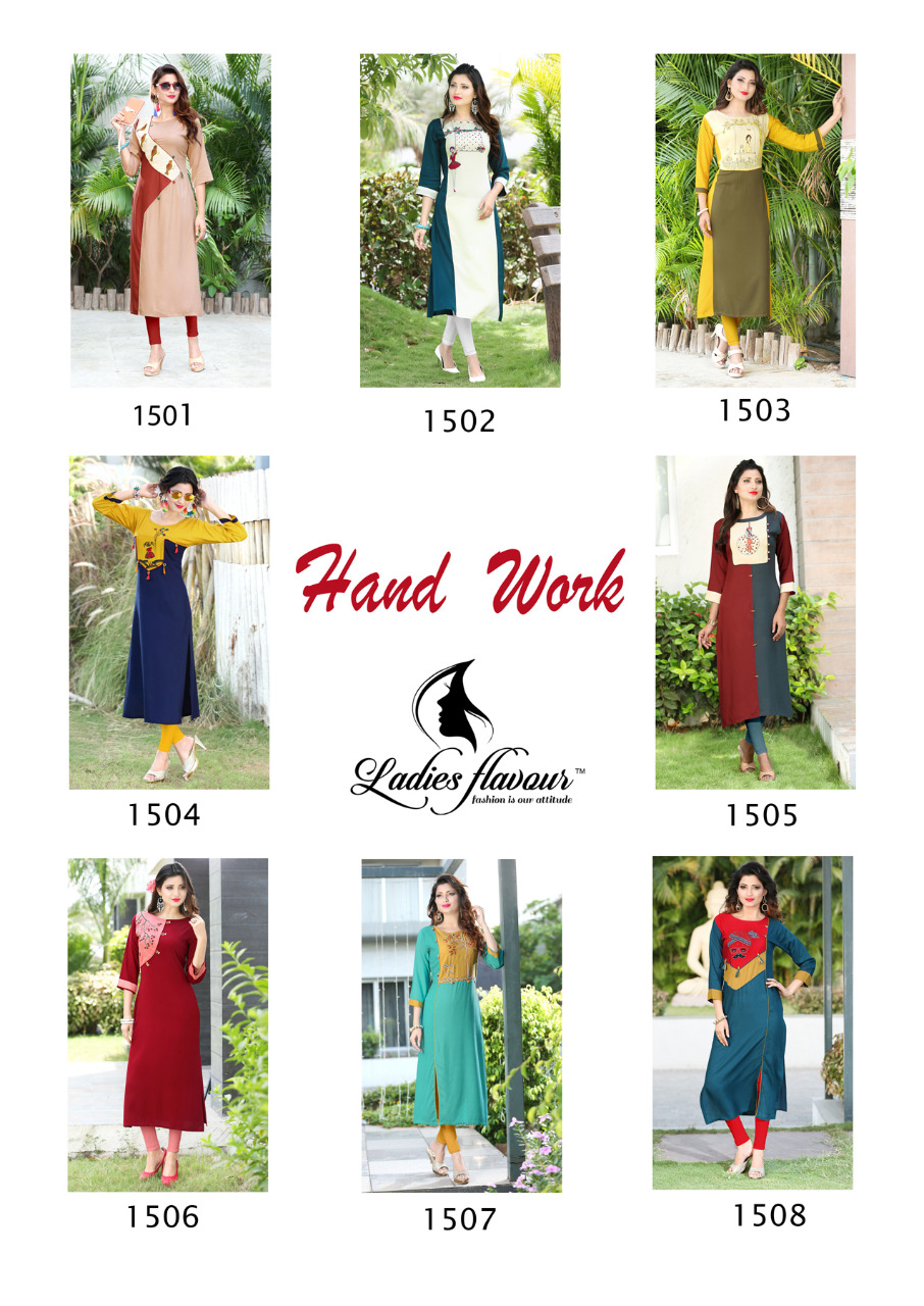 Buy Online Ladies Flavour Hand Work 1501 Series Reyon Kurti Wholesale Dealer And Supplier Surat 8 Pcs of Full Catalogue at Wholesale Price. Looking for Ladies Flavour Hand Work 1501 Series Reyon Kurti Wholesale Dealer And Supplier Surat Full Catalouge at Best Price? Buy Now Ladies Flavour Hand Work 1501 Series Reyon Kurti Wholesale Dealer And Supplier Surat at Wholesale Rate of Rs 3800 with Total 8 Pcs from authroized dealer and supplier of Ladies Flavour Brand. Cost of Each piece is just only Rs 475 which is very low and affordable price to resale the product in your retail store ,This is Surat based Wholesale Supplier & Dealer of Ladies Flavour Brand. Click on Brand name to Know more about Ladies Flavour Brand's products.Call or Whatsapp on 9898838984 for booking or enquiry