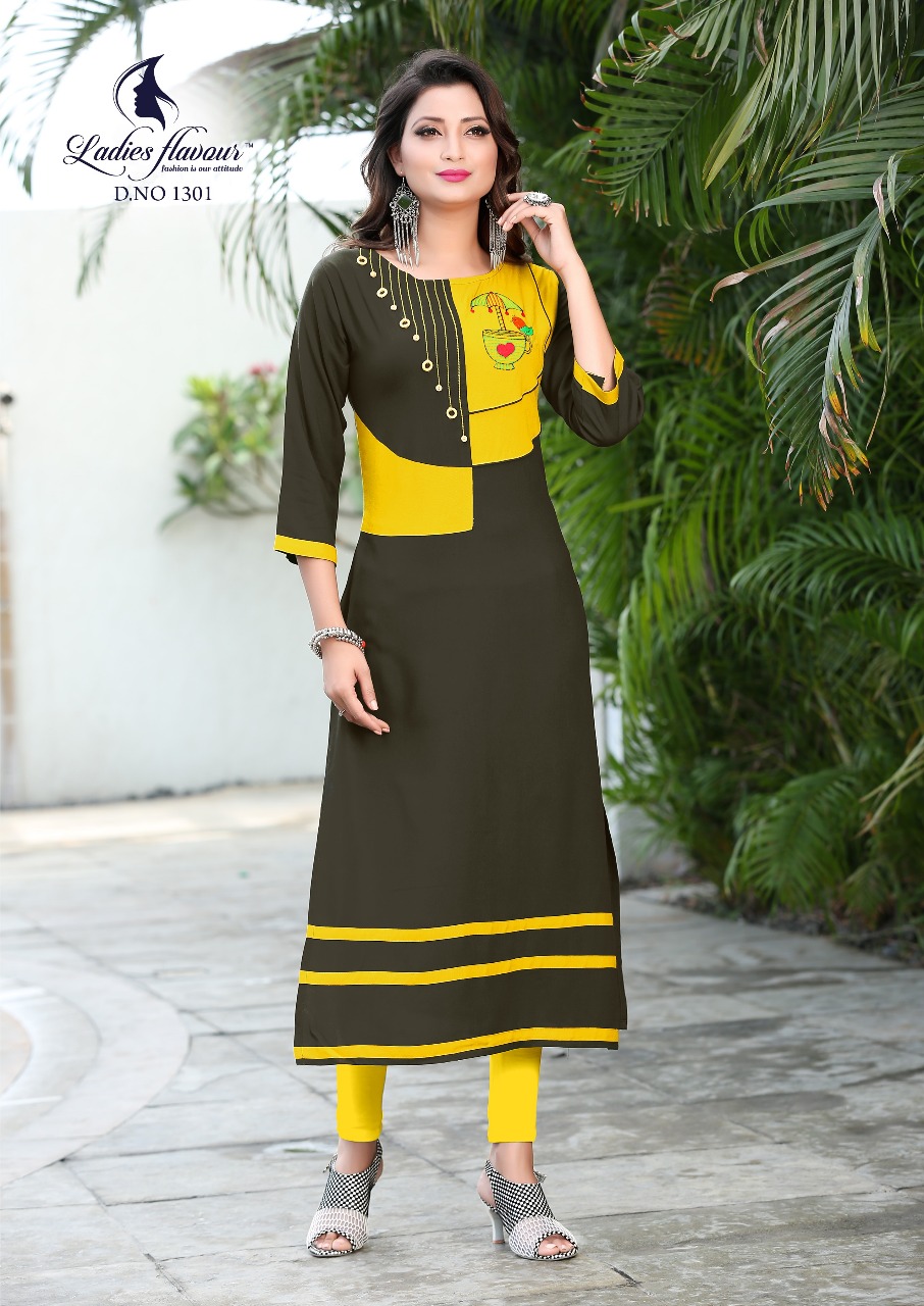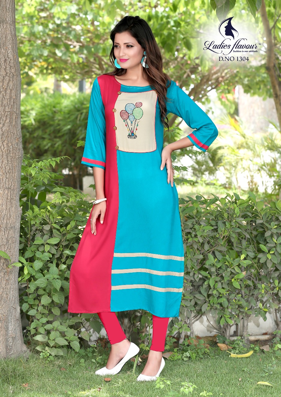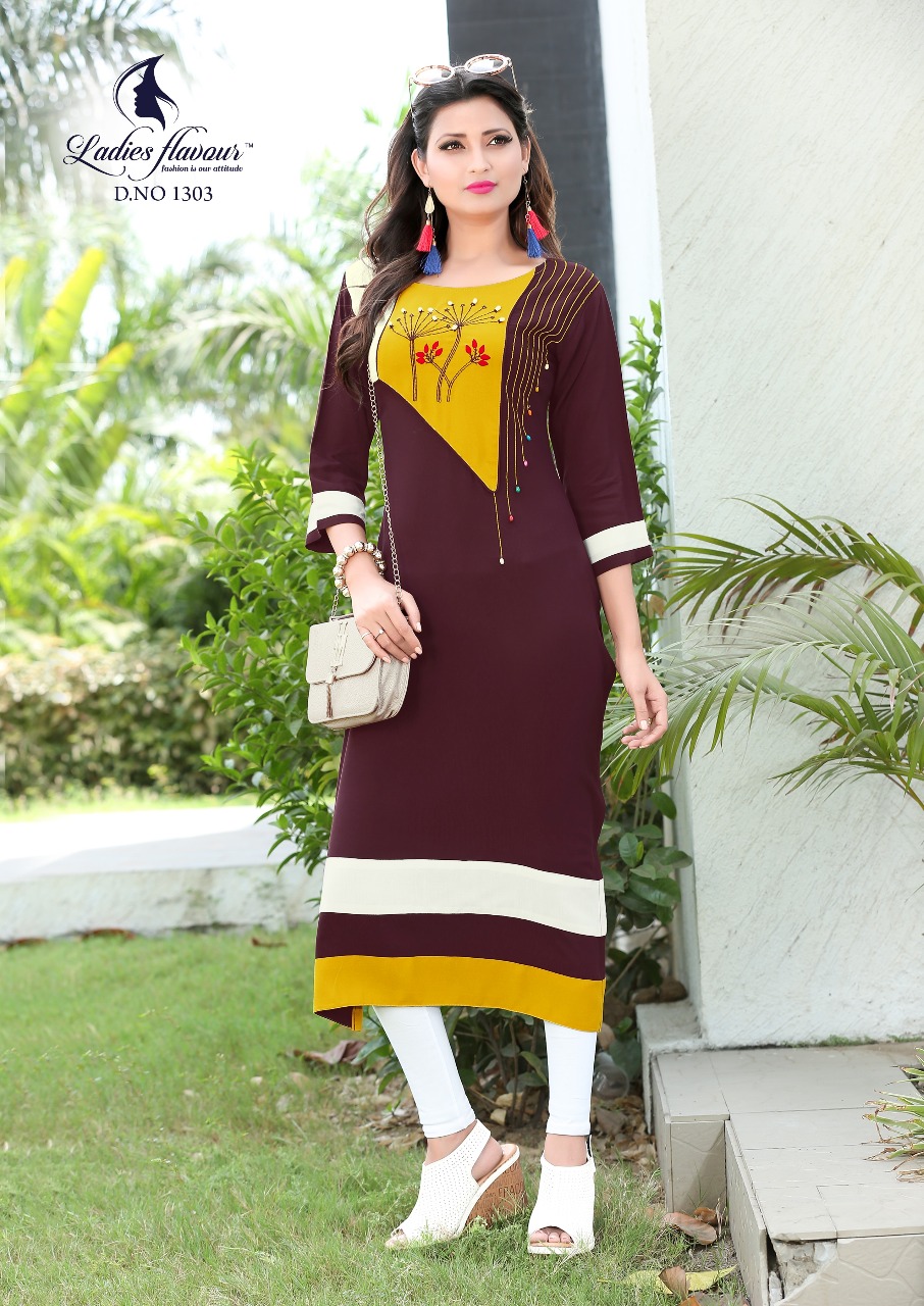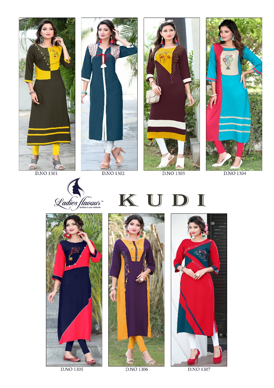Buy Online Ladies Flavour Kudi 1301 Series Fancy Reyon Embroidery Kurti Catlog Wholesaler And Supplier Surat 7 Pcs of Full Catalogue at Wholesale Price. Looking for Ladies Flavour Kudi 1301 Series Fancy Reyon Embroidery Kurti Catlog Wholesaler And Supplier Surat Full Catalouge at Best Price? Buy Now Ladies Flavour Kudi 1301 Series Fancy Reyon Embroidery Kurti Catlog Wholesaler And Supplier Surat at Wholesale Rate of Rs 3150 with Total 7 Pcs from authroized dealer and supplier of Ladies Flavour Brand. Cost of Each piece is just only Rs 450 which is very low and affordable price to resale the product in your retail store ,This is Surat based Wholesale Supplier & Dealer of Ladies Flavour Brand. Click on Brand name to Know more about Ladies Flavour Brand's products.Call or Whatsapp on 9898838984 for booking or enquiry
