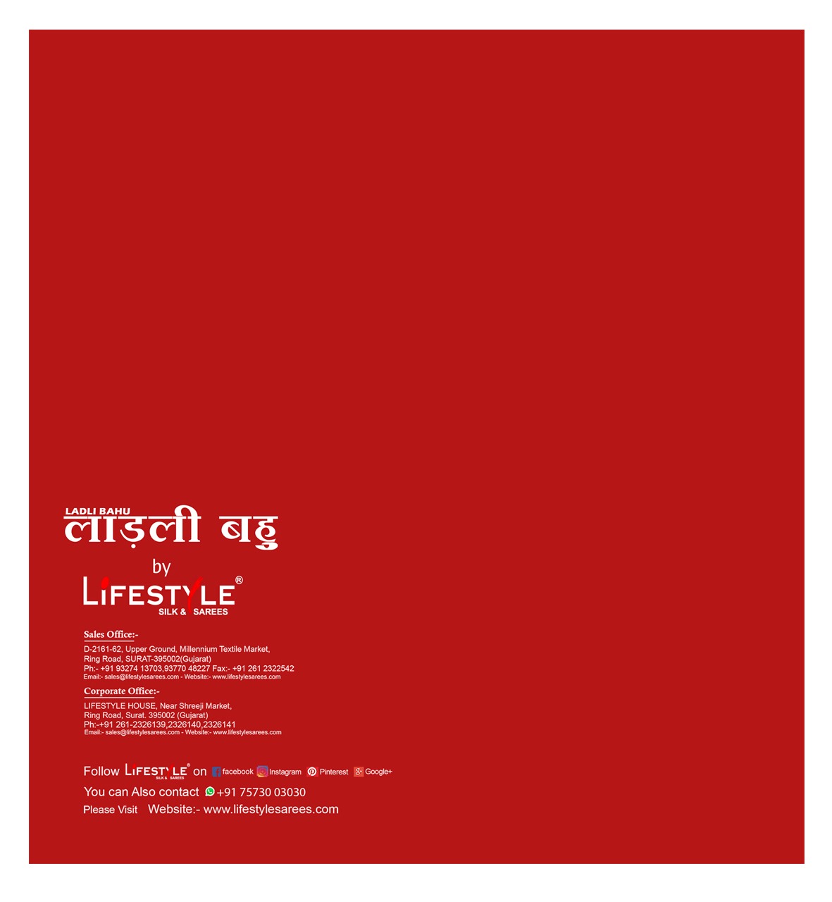Buy Online Ladli Bahu By Lifestyle Manufacturer Traders Surat 6 Pcs of Full Catalogue at Wholesale Price. Looking for Ladli Bahu By Lifestyle Manufacturer Traders Surat Full Catalouge at Best Price? Buy Now Ladli Bahu By Lifestyle Manufacturer Traders Surat at Wholesale Rate of Rs 10734 with Total 6 Pcs from authroized dealer and supplier of LIFESTYLE Brand. Cost of Each piece is just only Rs 1789 which is very low and affordable price to resale the product in your retail store ,This is Surat based Wholesale Supplier & Dealer of LIFESTYLE Brand. Click on Brand name to Know more about LIFESTYLE Brand's products.Call or Whatsapp on 9898838984 for booking or enquiry