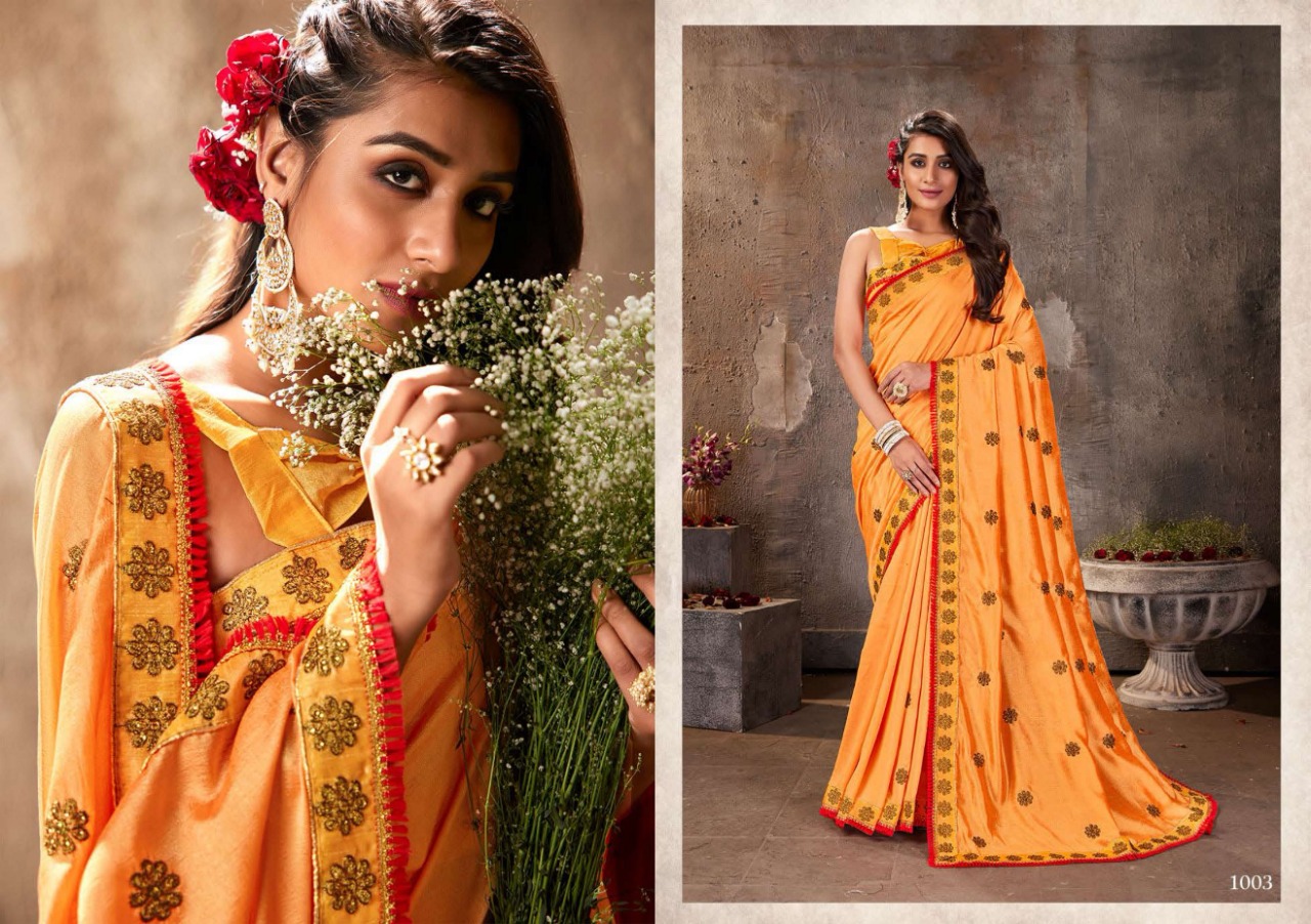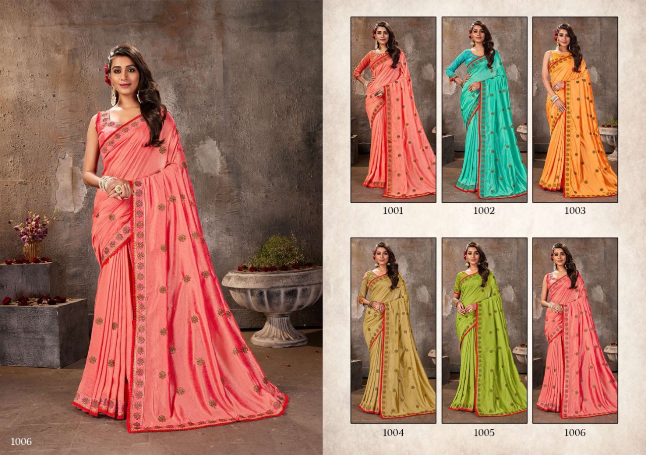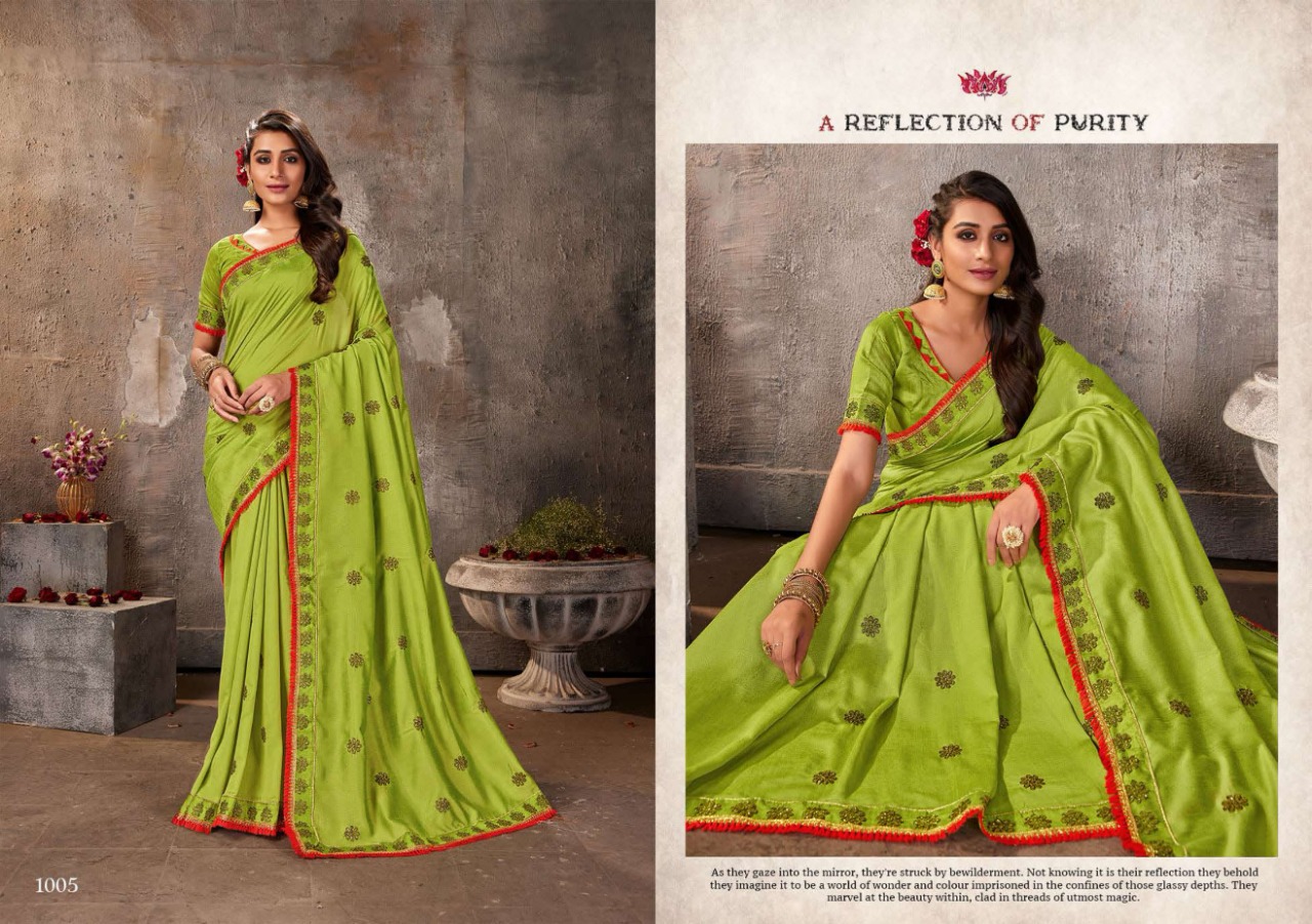 Brand - saroj . *Lamha (Rs.815 per pcs ) * Set to set Fabric: Soft P x C Vichitra Dyed Silk with Beauti Full Border and butti. Blouse: Banglori Silk. 6 Design in set . |
