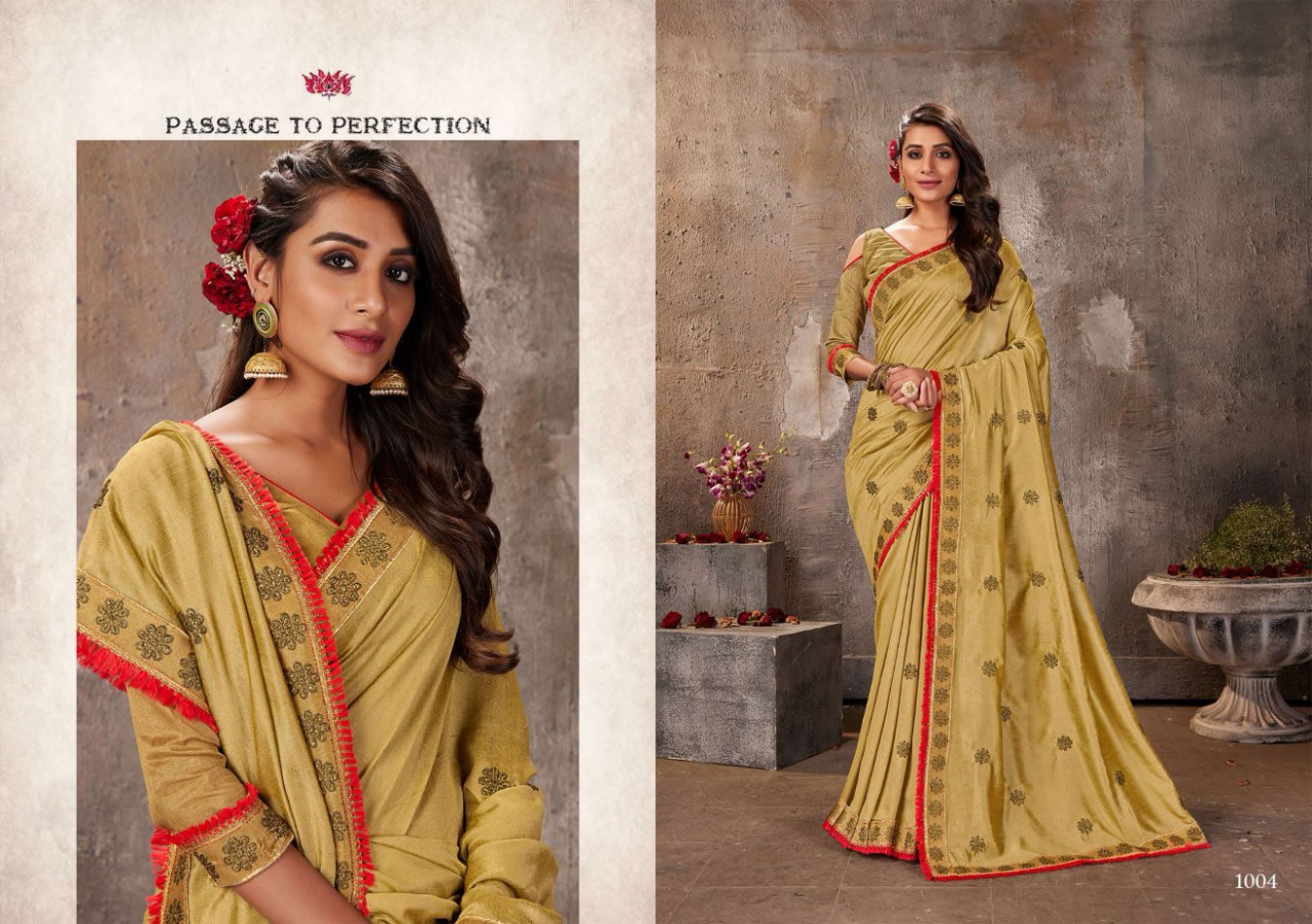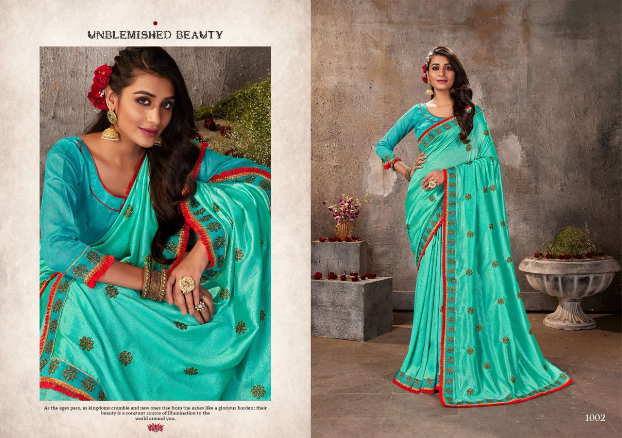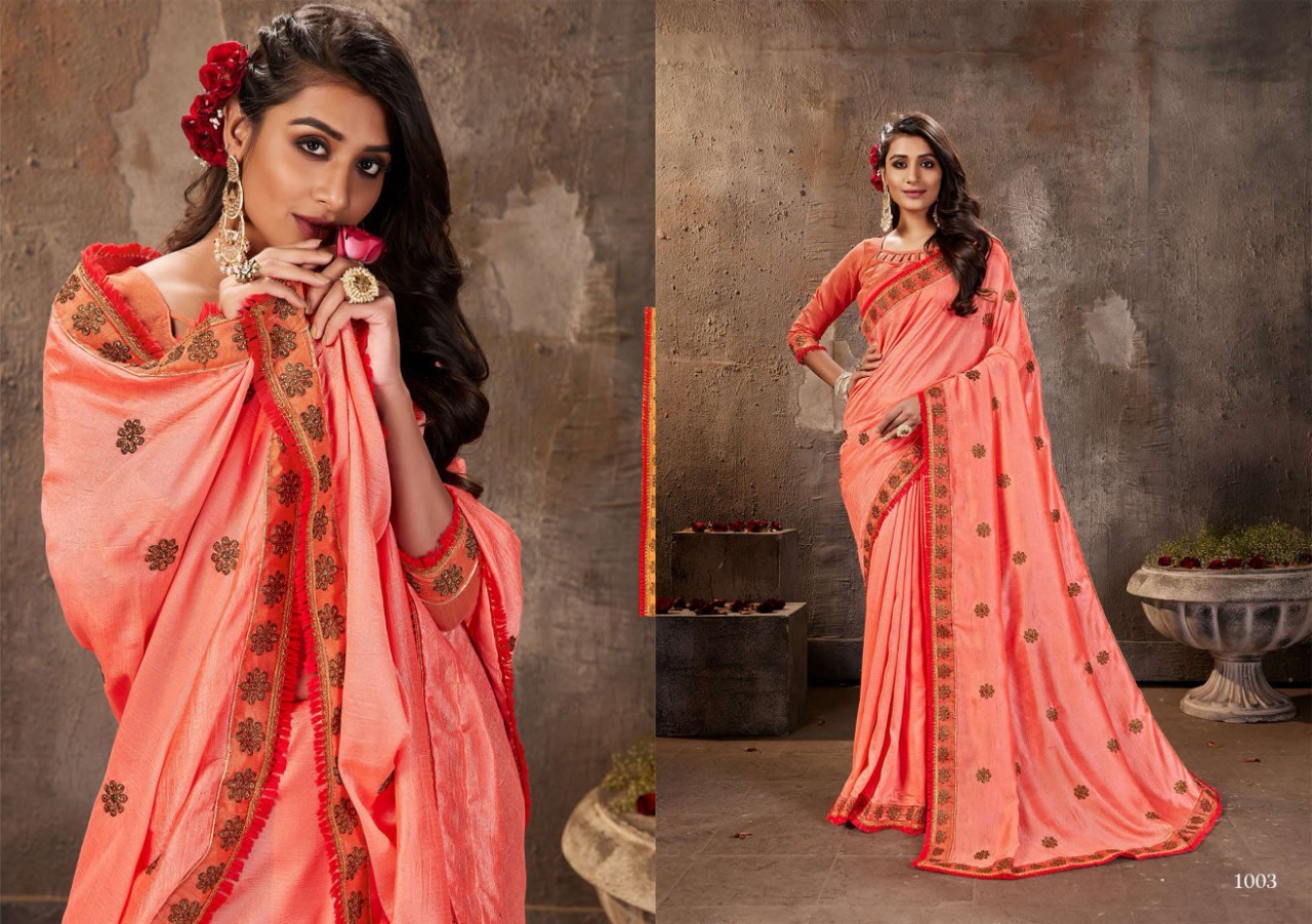Brand - saroj . *Lamha (Rs.815 per pcs ) * Set to set Fabric: Soft P x C Vichitra Dyed Silk with Beauti Full Border and butti. Blouse: Banglori Silk. 6 Design in set . |