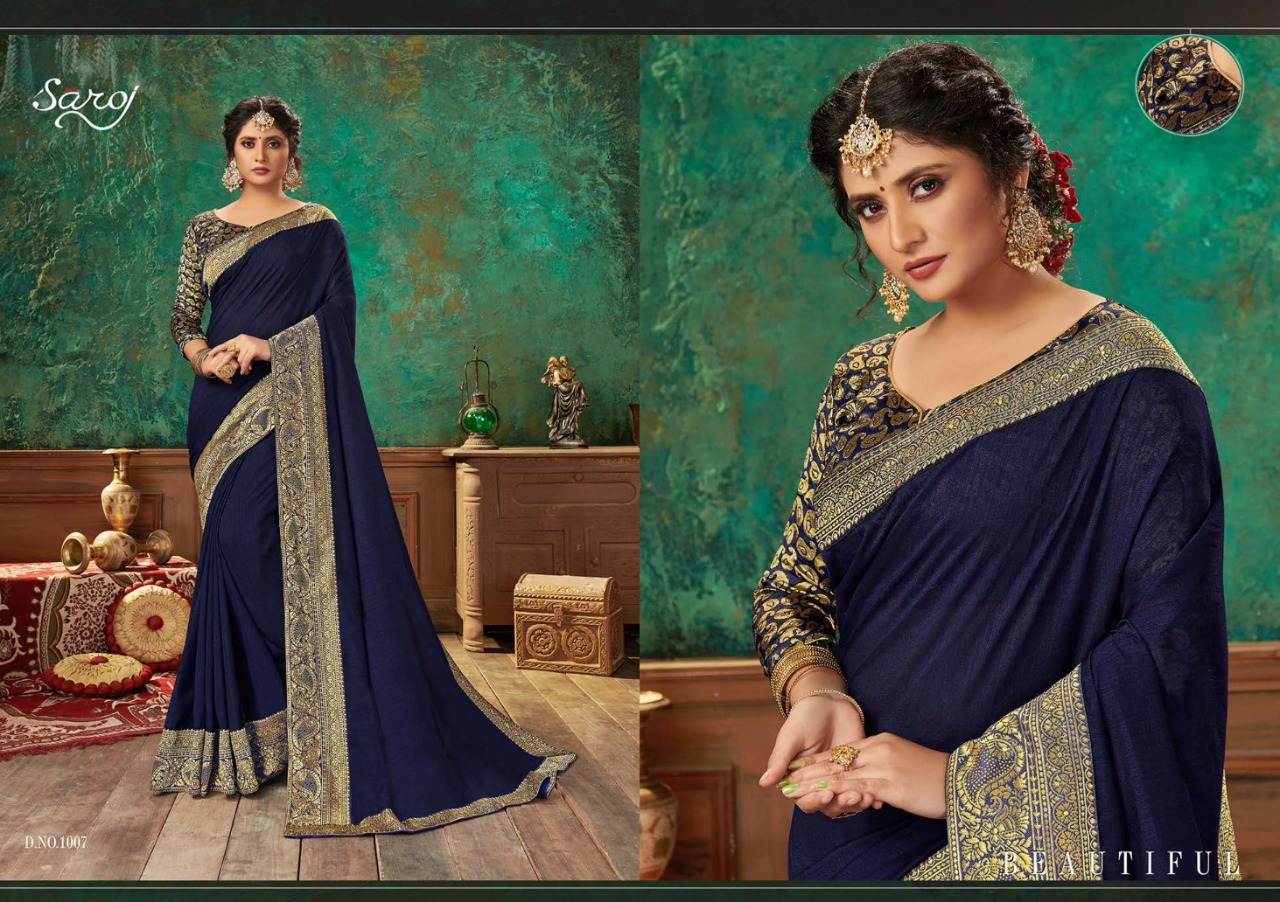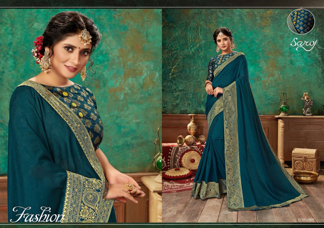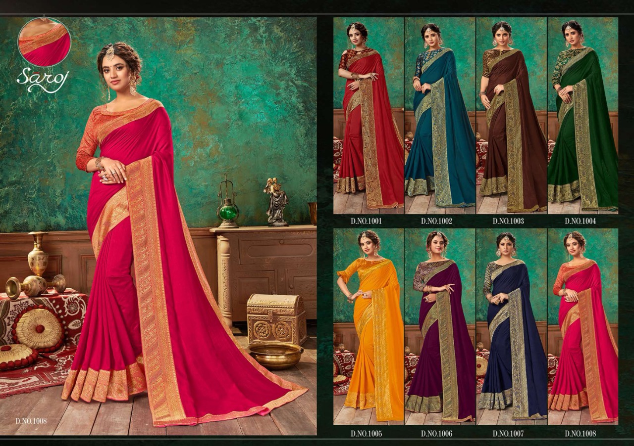 Brand - Saroj . *Lashkara * Rate - 810 per pcs . Set to set GST 5 Percent Extra Fabric: Soft Vichitra Silk with Heavy Border. Blouse: Brocade silk with Viving Work. 8 Design in set |