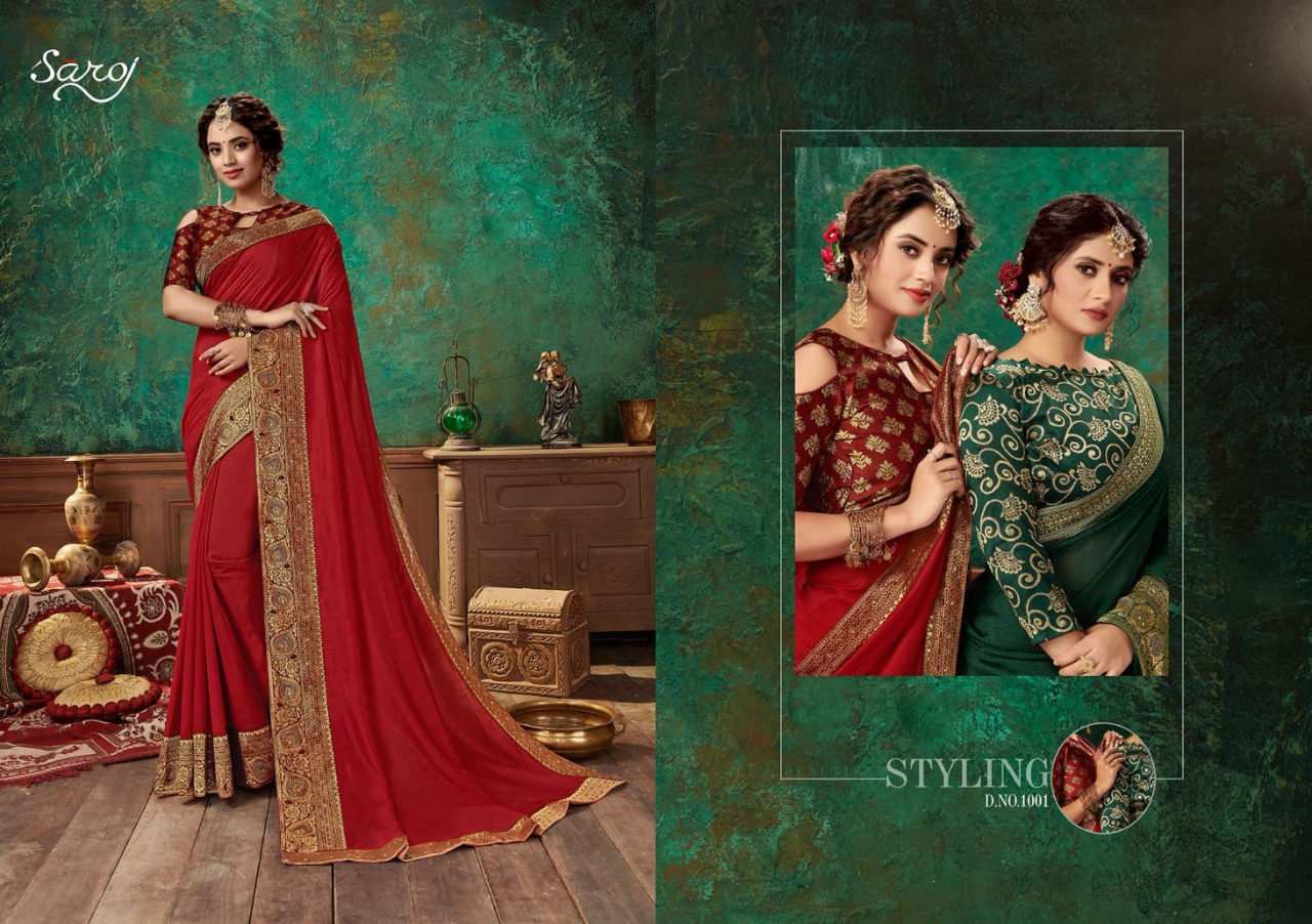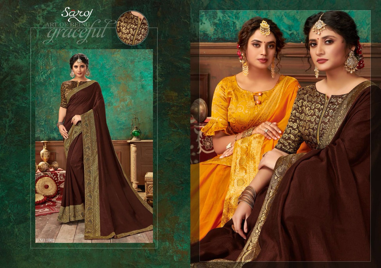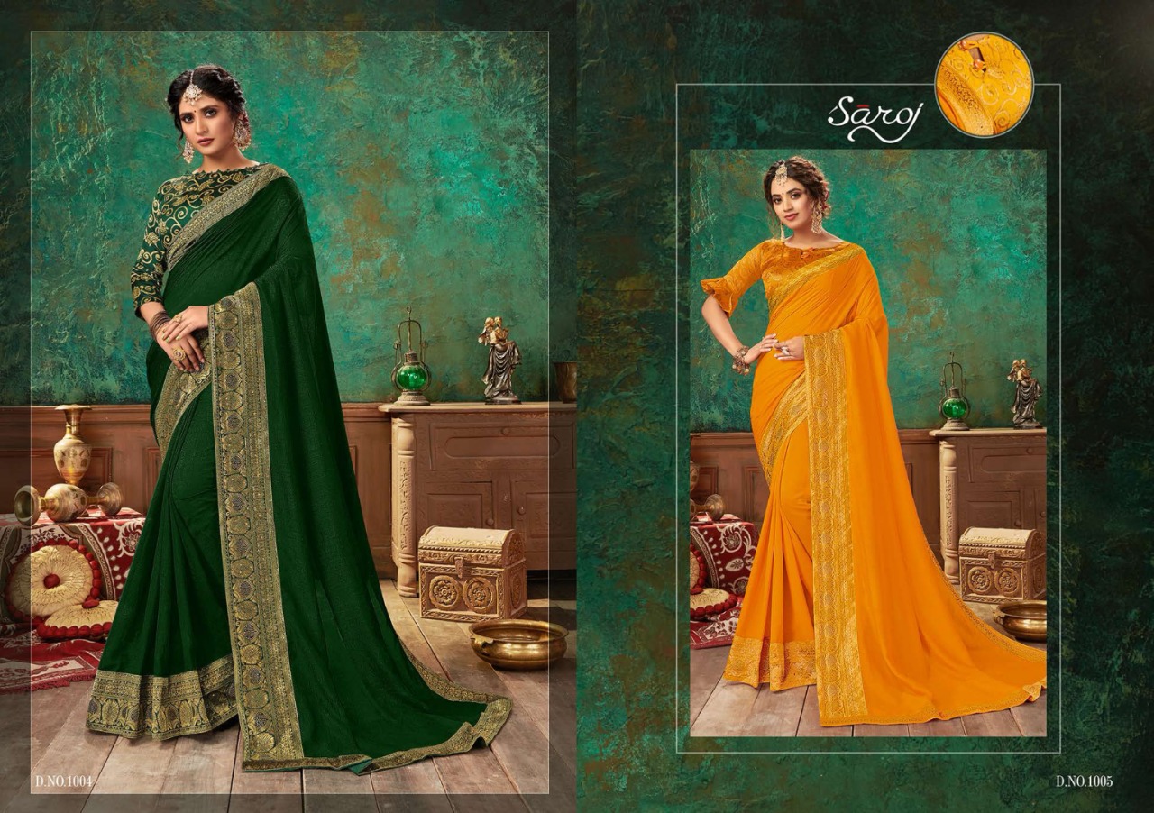 Brand - Saroj . *Lashkara * Rate - 810 per pcs . Set to set GST 5 Percent Extra Fabric: Soft Vichitra Silk with Heavy Border. Blouse: Brocade silk with Viving Work. 8 Design in set |