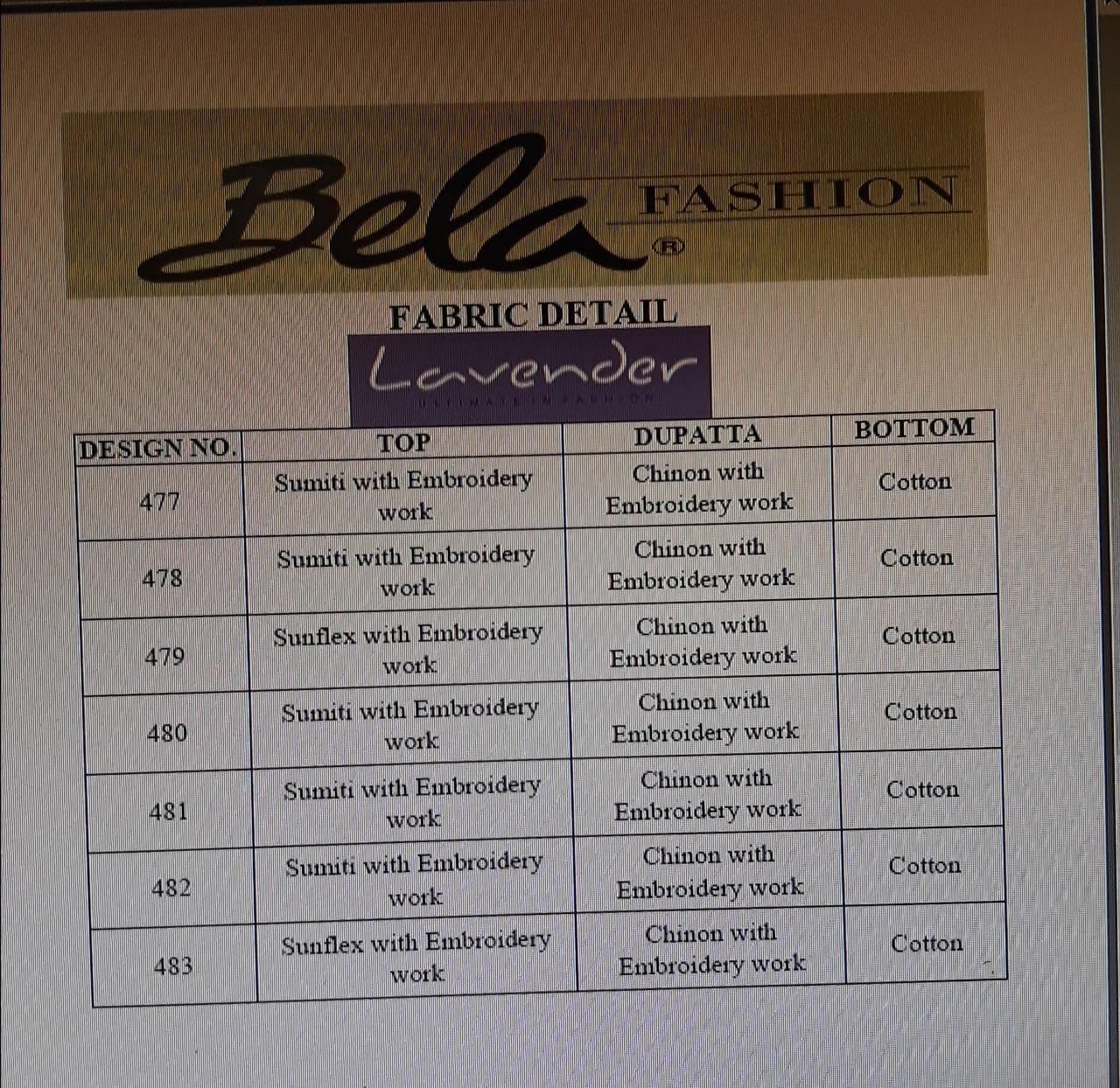 Buy Online Lavender By Bela Fashion Series 477 To 483 Embroidered Designer Suits Wholesale Supplier Gujarat 7 Pcs of Full Catalogue at Wholesale Price. Looking for Lavender By Bela Fashion Series 477 To 483 Embroidered Designer Suits Wholesale Supplier Gujarat Full Catalouge at Best Price? Buy Now Lavender By Bela Fashion Series 477 To 483 Embroidered Designer Suits Wholesale Supplier Gujarat at Wholesale Rate of Rs 11340 with Total 7 Pcs from authroized dealer and supplier of BELA Brand. Cost of Each piece is just only Rs 1620 which is very low and affordable price to resale the product in your retail store ,This is Surat based Wholesale Supplier & Dealer of BELA Brand. Click on Brand name to Know more about BELA Brand's products.Call or Whatsapp on 9898838984 for booking or enquiry