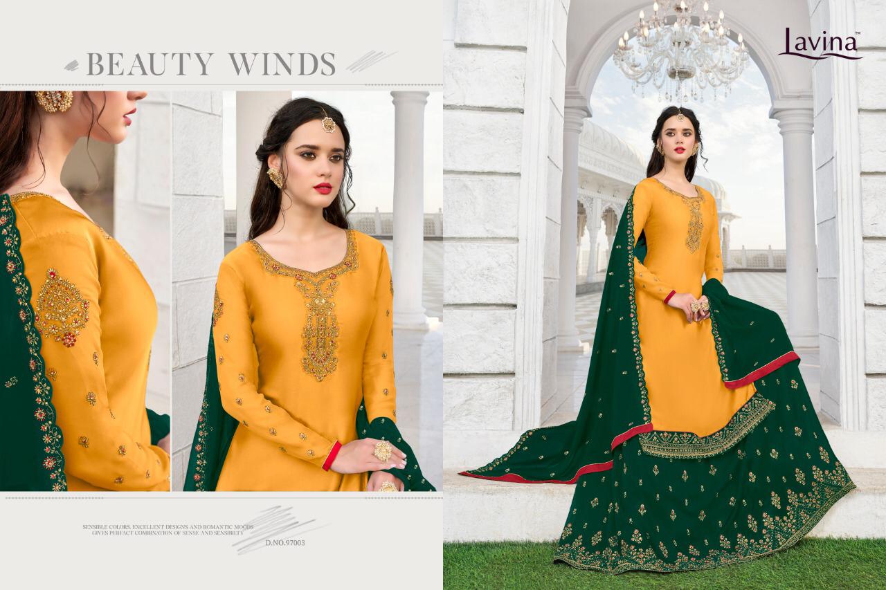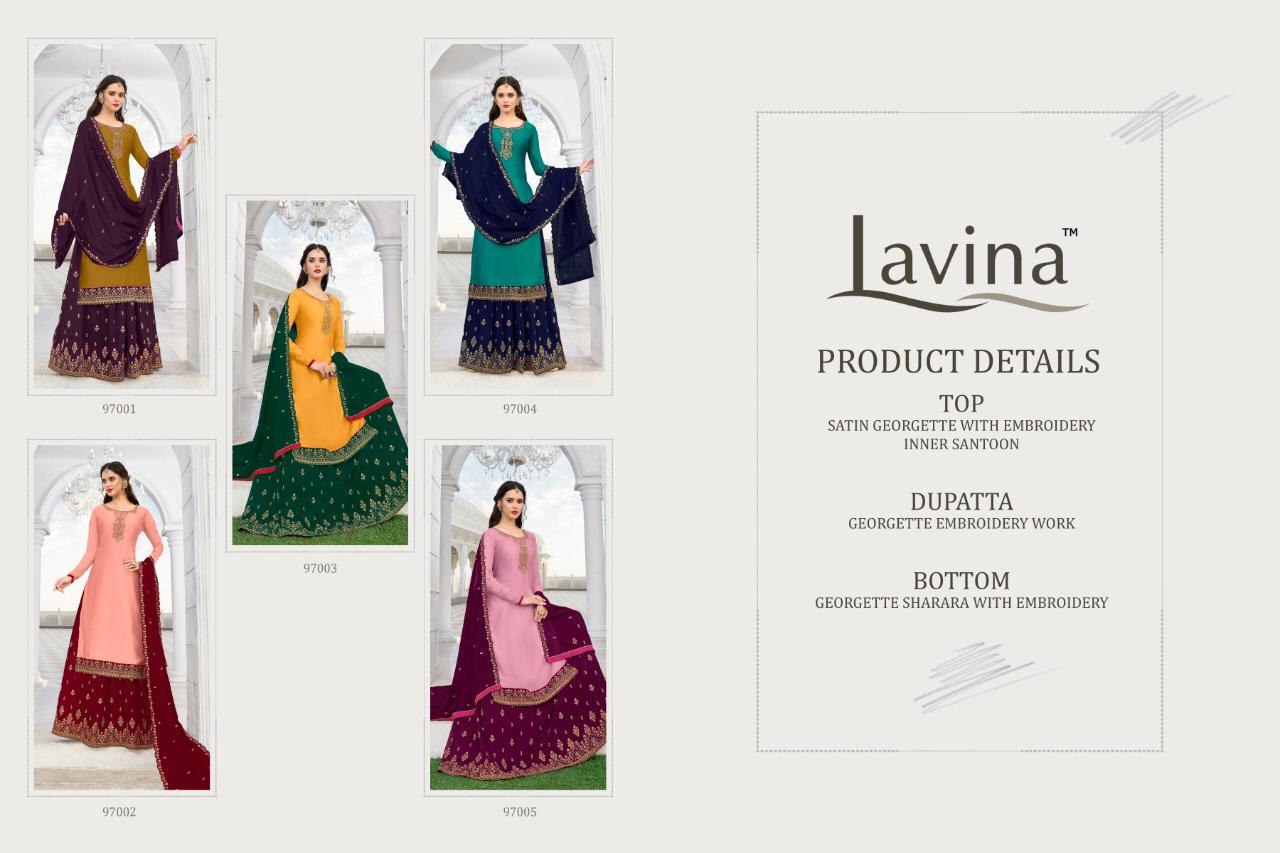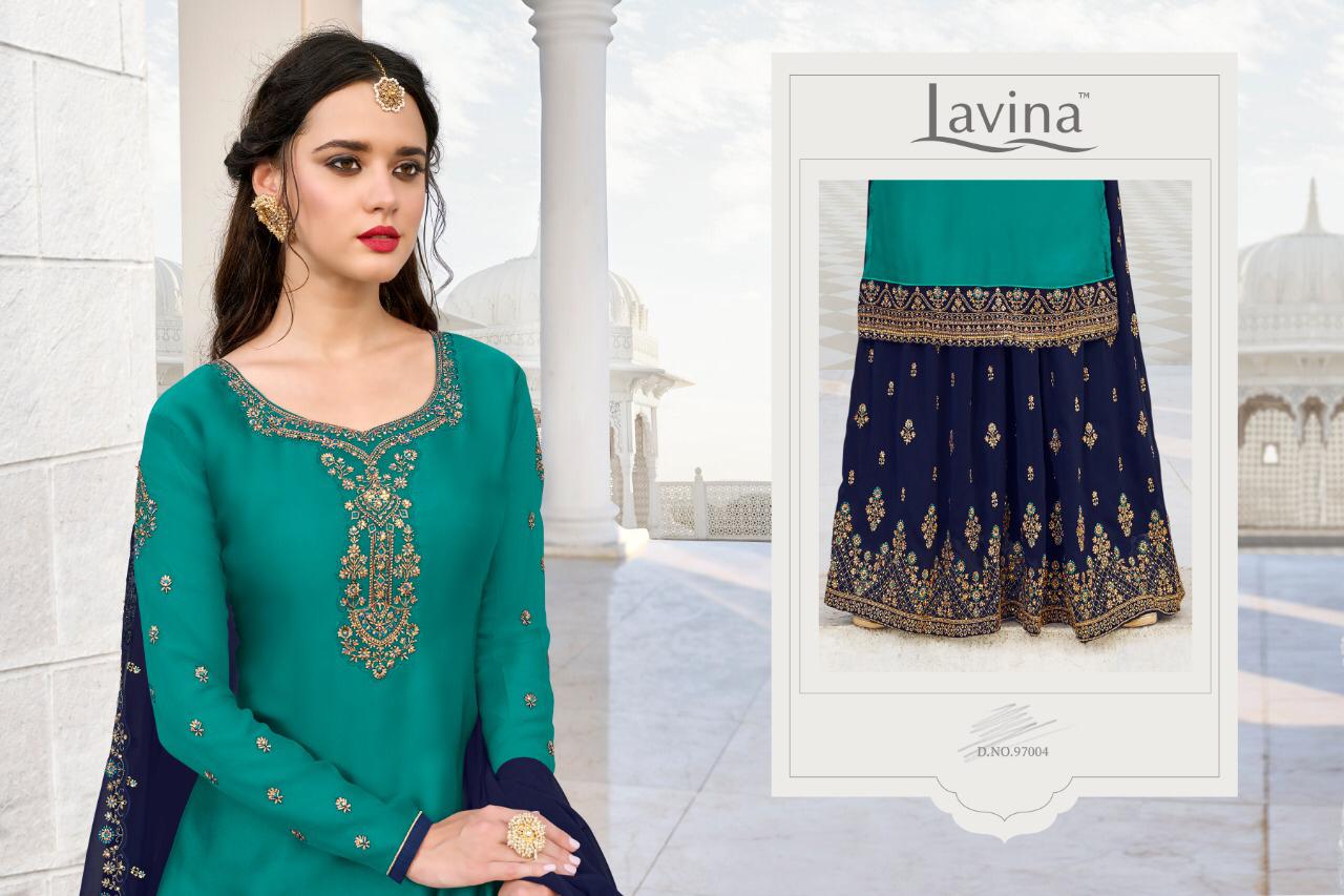 Buy Online Lavina 97 Nx Series 97001 To 97005 Designer Party Wear Suits Wholesale Supplier Gujarat 5 Pcs of Full Catalogue at Wholesale Price. Looking for Lavina 97 Nx Series 97001 To 97005 Designer Party Wear Suits Wholesale Supplier Gujarat Full Catalouge at Best Price? Buy Now Lavina 97 Nx Series 97001 To 97005 Designer Party Wear Suits Wholesale Supplier Gujarat at Wholesale Rate of Rs 10495 with Total 5 Pcs from authroized dealer and supplier of LAVINA Brand. Cost of Each piece is just only Rs 2099 which is very low and affordable price to resale the product in your retail store ,This is Surat based Wholesale Supplier & Dealer of LAVINA Brand. Click on Brand name to Know more about LAVINA Brand's products.Call or Whatsapp on 9898838984 for booking or enquiry